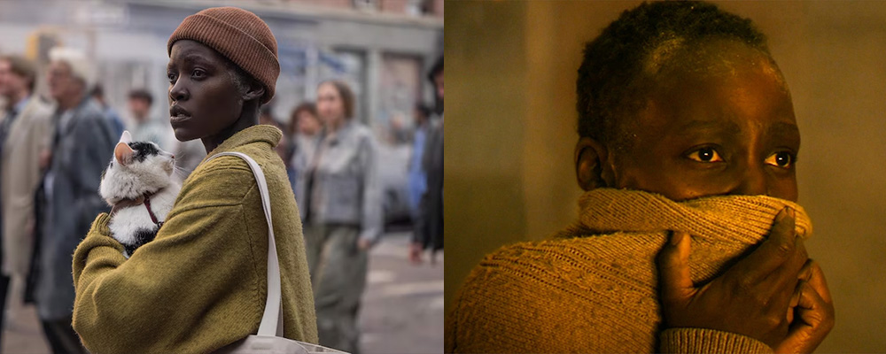 A Quiet Place – Giorno 1, essendo un prequel, racconta invece come si sono svolte le prime ore dell’attacco alieno (brevemente anticipato in A Quiet Place II) e la protagonista è ora Samira, Sam, una malata terminale che si ritrova in un teatro di marionette a New York, insieme al suo gatto Frodo, quando oggetti simili a meteoriti attaccano la città; insieme a lei, la compagnia di diverse figure maschili: l’operatore assistenziale Reuben, Henry (un sopravvissuto che diventerà poi il capo di una colonia nel sequel) ed Eric, uno studente di legge.