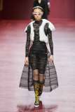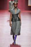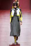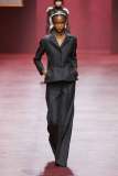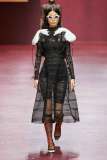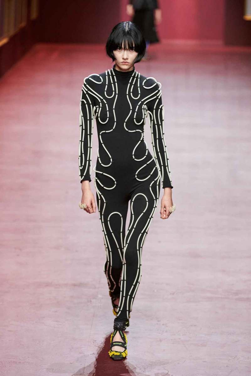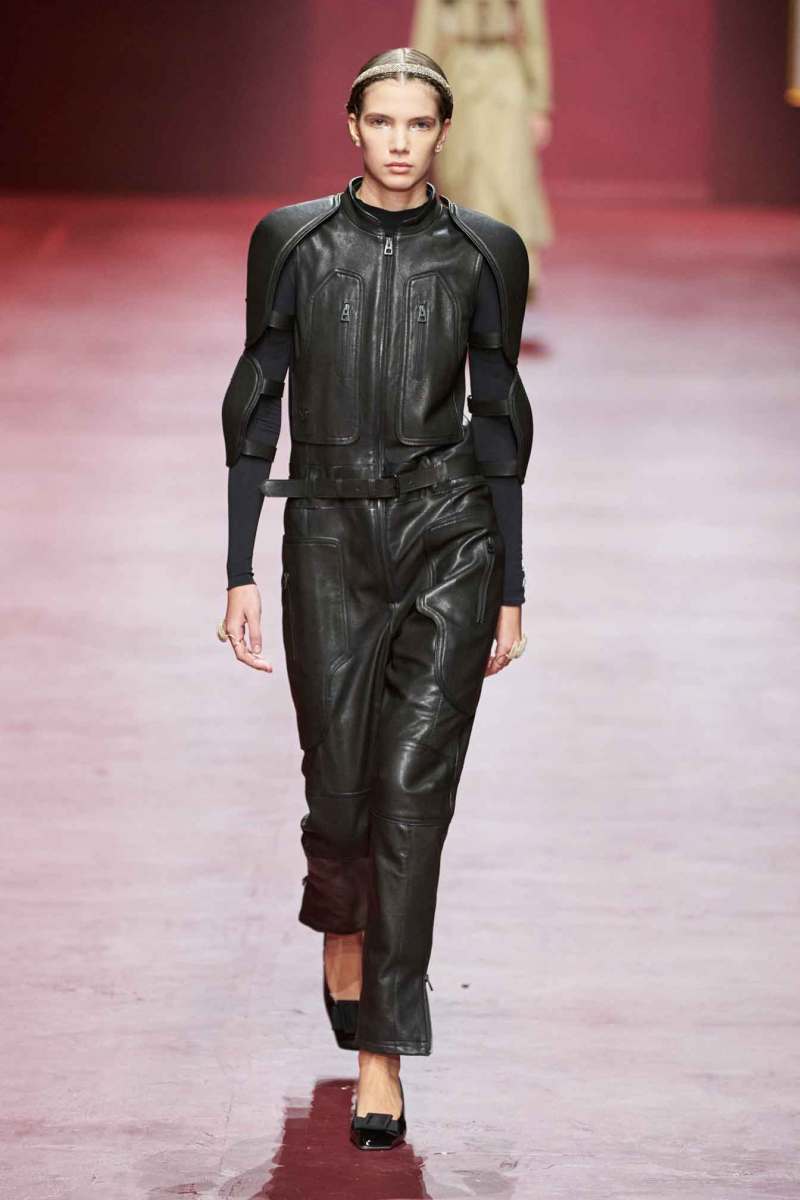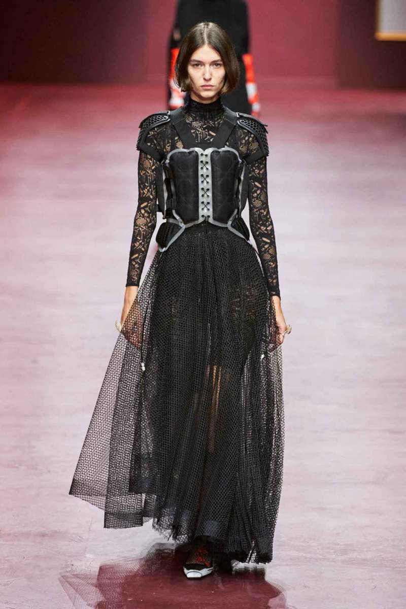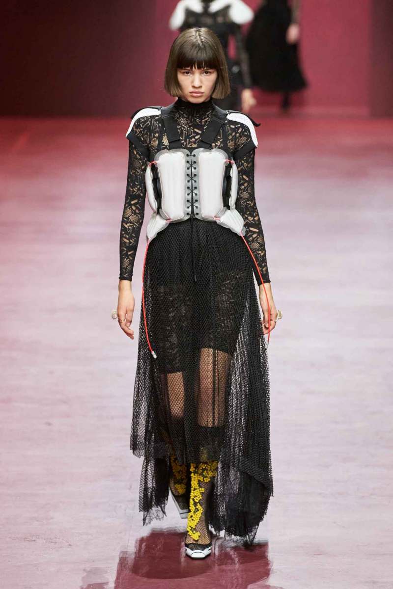 La sfilata parigina, presentata in un hangar allestito con le opere dell’artista femminista Mariella Bettineschi, si apre con una tuta nera aderente che si illumina al buio, proiettandoci subito in un’atmosfera futuristica, di innovazione e sperimentazione. Nei look successivi le modelle indossano, sopra ad abiti eleganti e raffinati, giubbetti protettivi che richiamano corsetti e che si muovono da soli sui corpi.