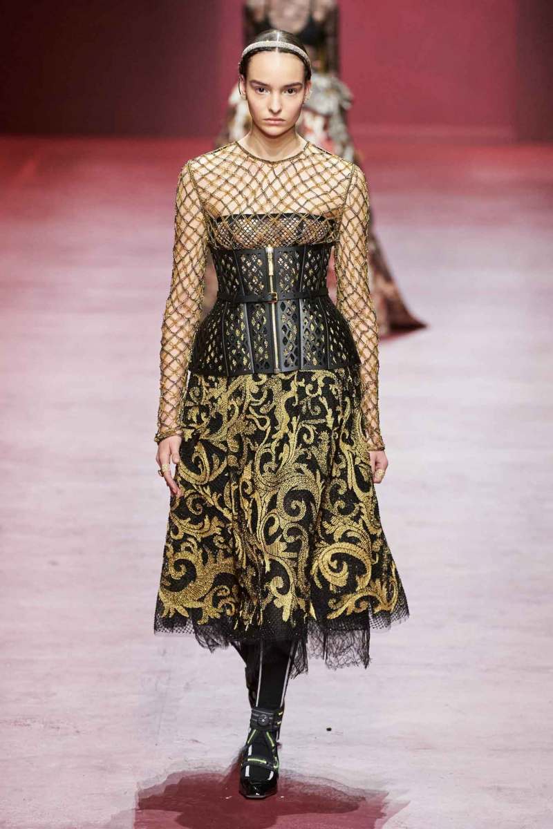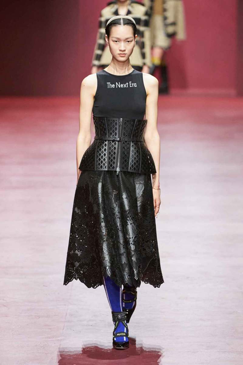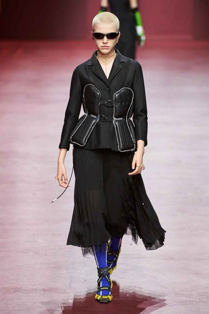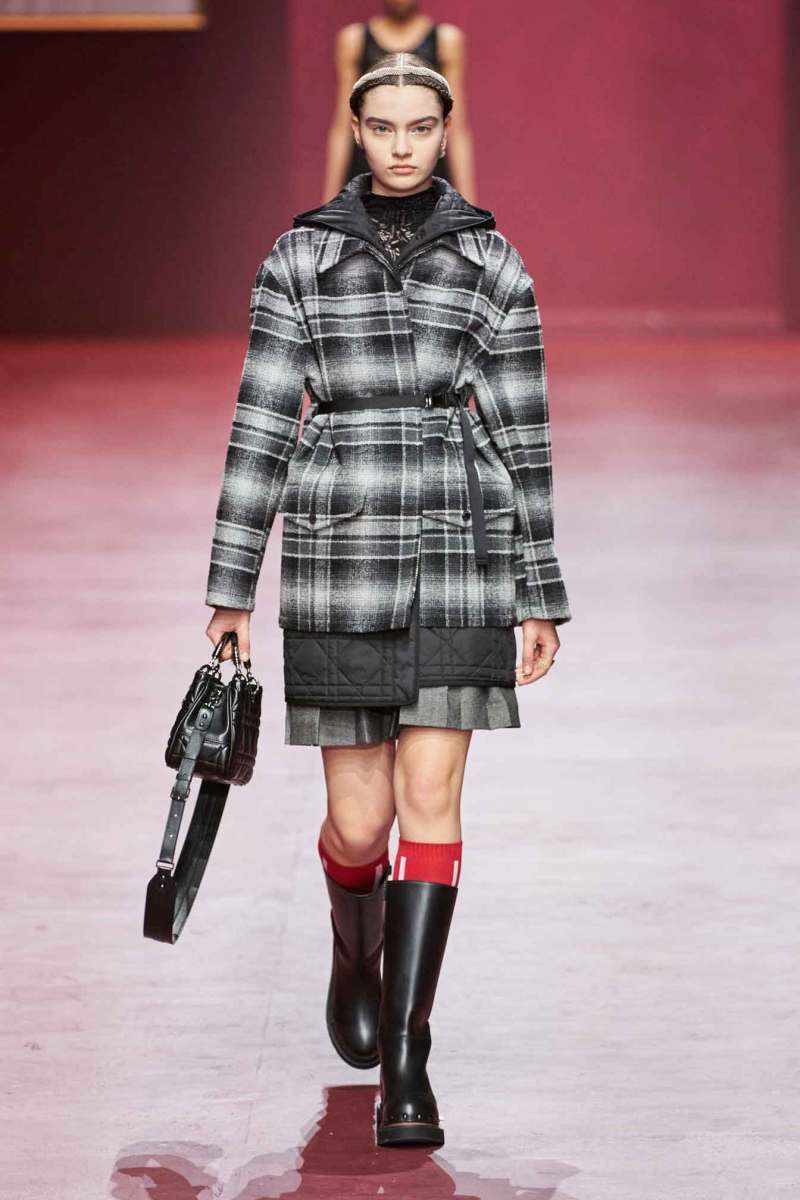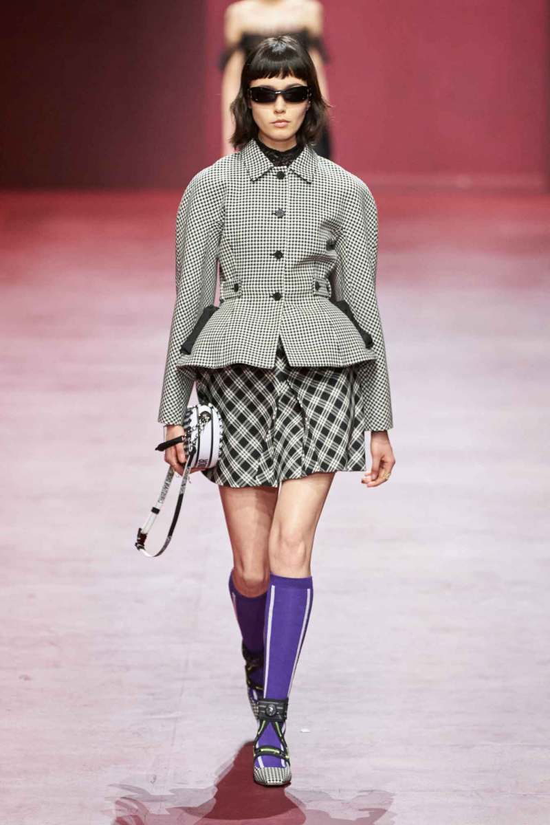La vita è messa particolarmente in risalto da bustini neri traforati e da cinture di tutti i tipi, senza contare la scelta dell’iconica Bar Jacket, che da sola modella il corpo. I quadretti bianchi e neri di diverse dimensioni sono un’altra costante della collezione che ritroviamo nelle gonne, nelle giacche, nei capispalla e perfino nelle scarpe.