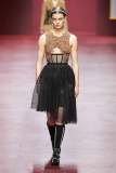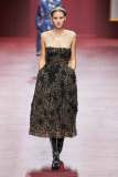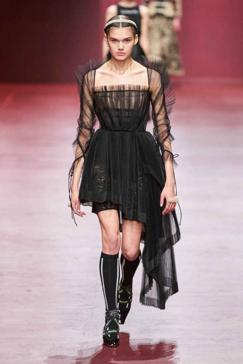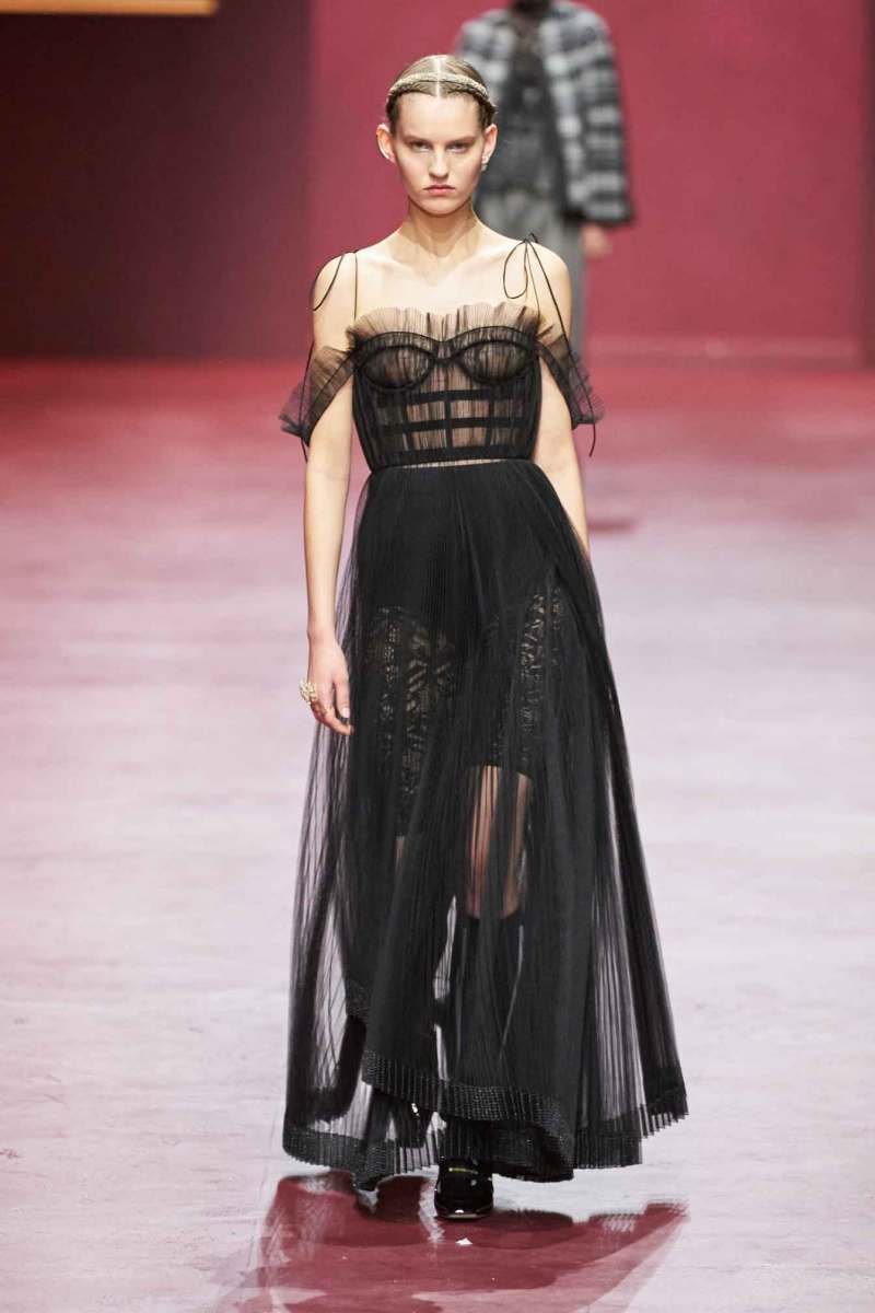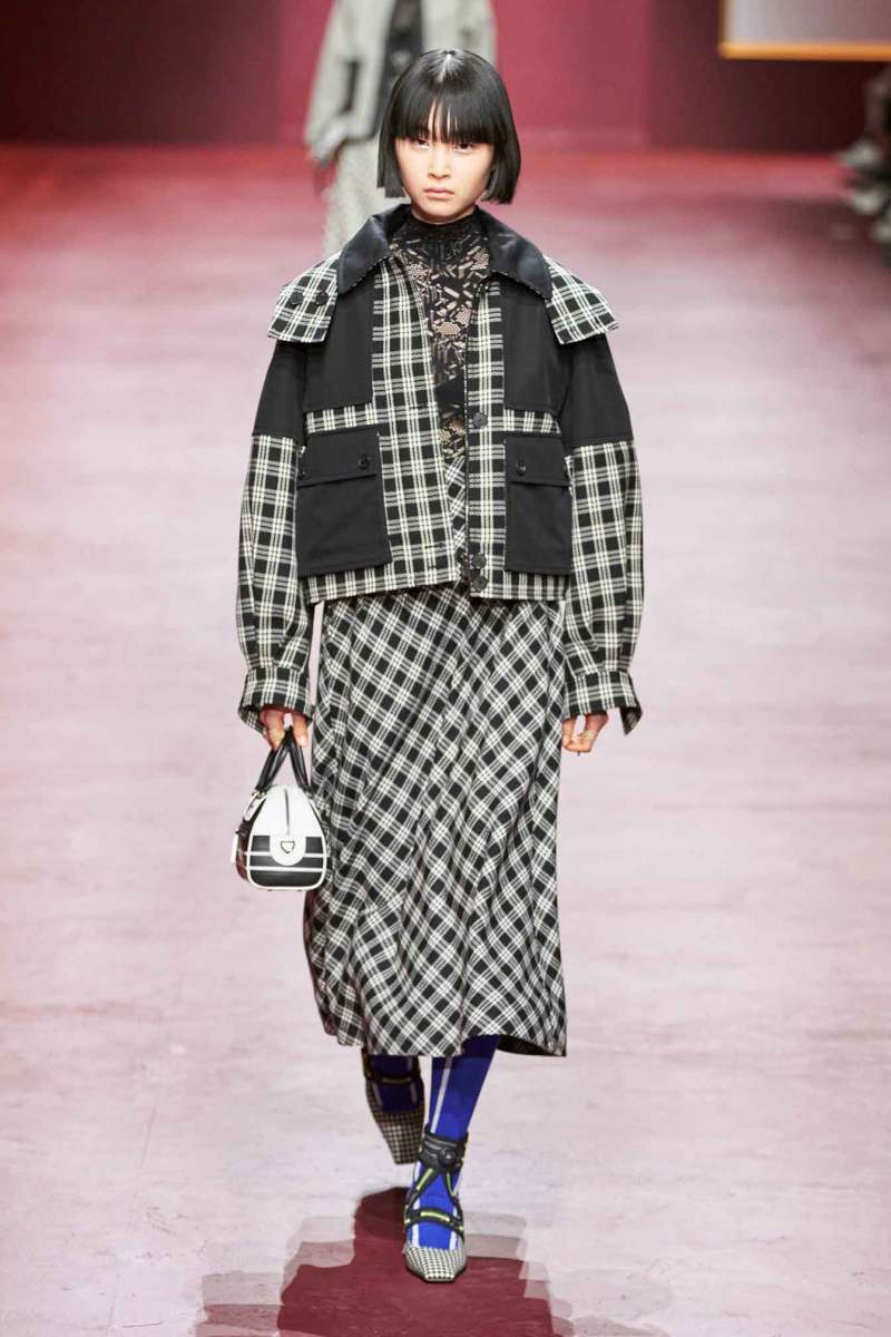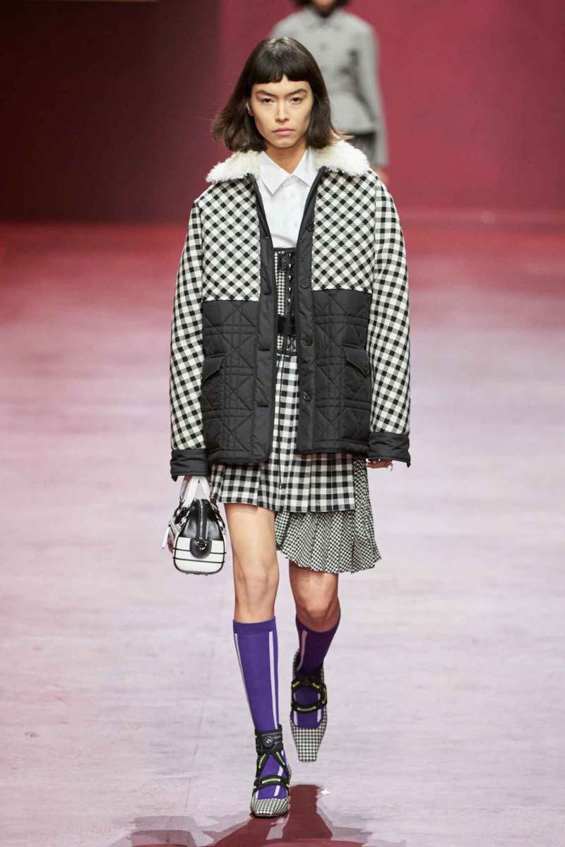 La vita è messa particolarmente in risalto da bustini neri traforati e da cinture di tutti i tipi, senza contare la scelta dell’iconica Bar Jacket, che da sola modella il corpo. I quadretti bianchi e neri di diverse dimensioni sono un’altra costante della collezione che ritroviamo nelle gonne, nelle giacche, nei capispalla e perfino nelle scarpe.