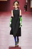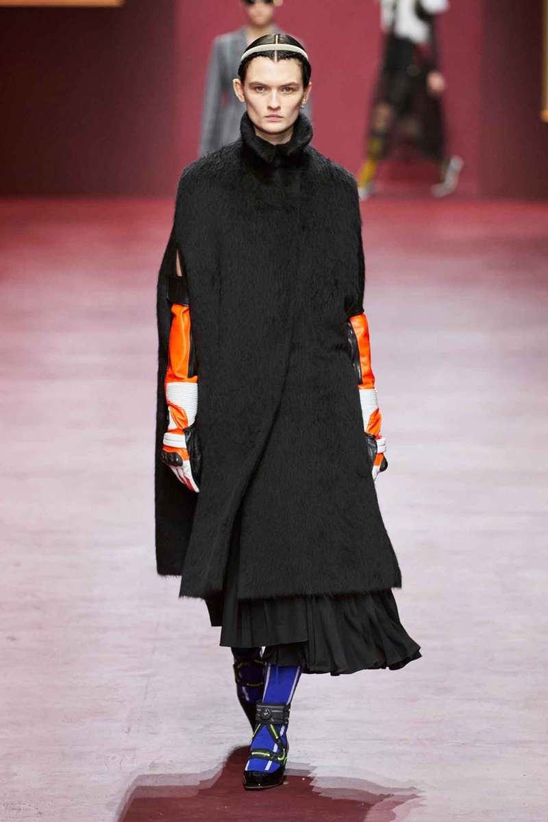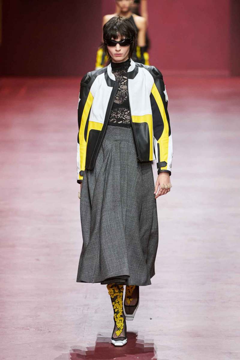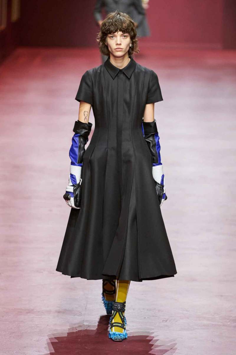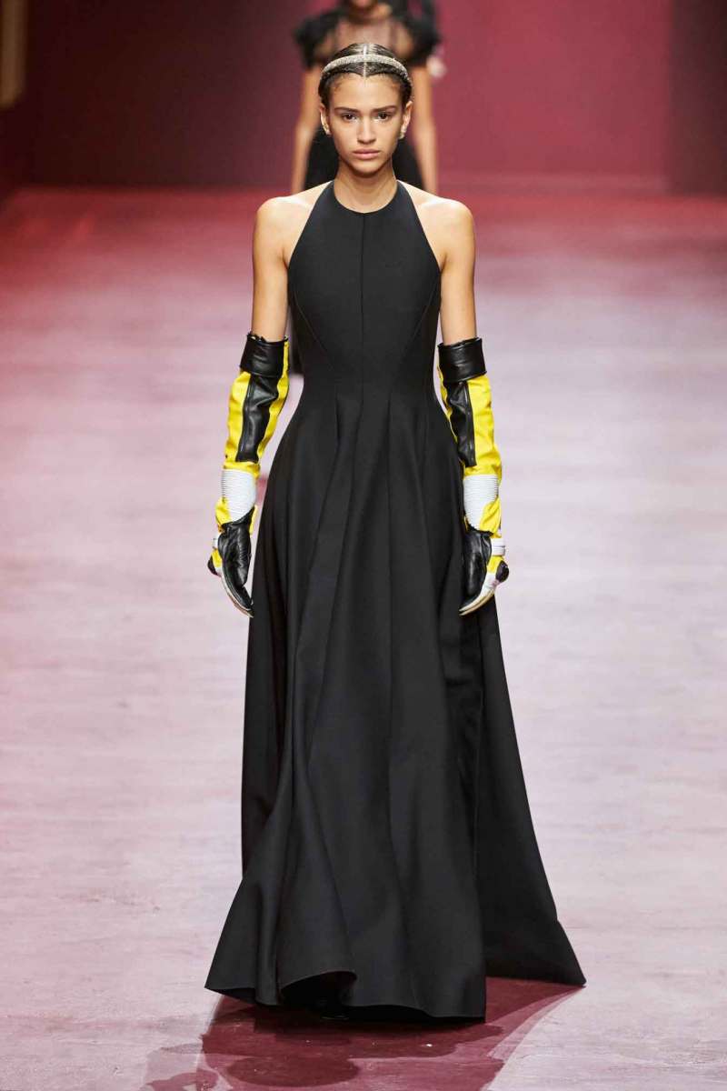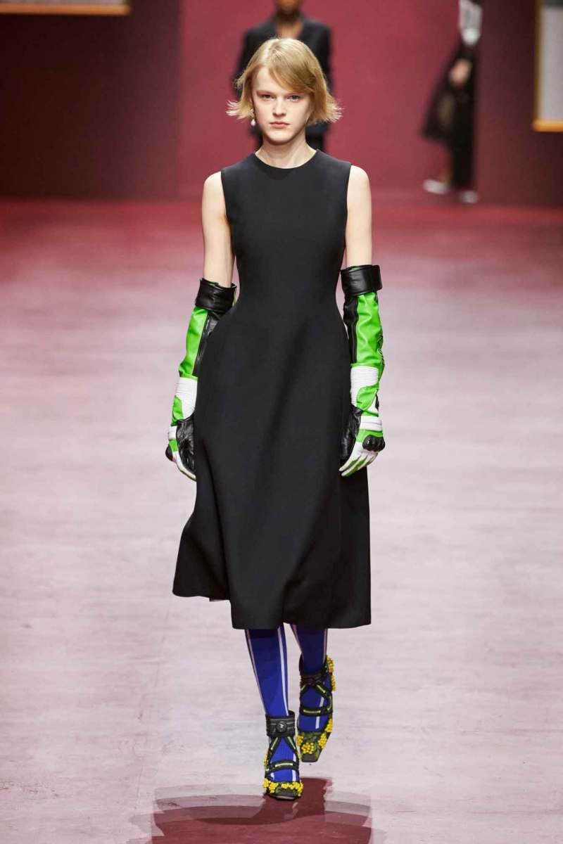 Una combinazione notevole di accessori ed elementi futuristici, che spezzano la raffinatezza e l’eleganza degli abiti e delle gonne in passerella. Dalle calze blu elettrico alle slingback futuristiche con dettagli neon, fino ai guanti in pelle dai colori altrettanto sgargianti.