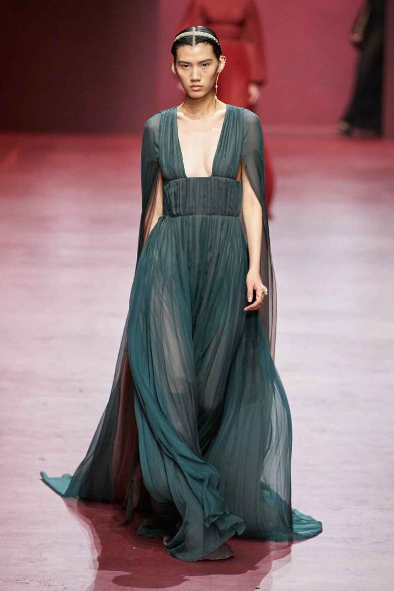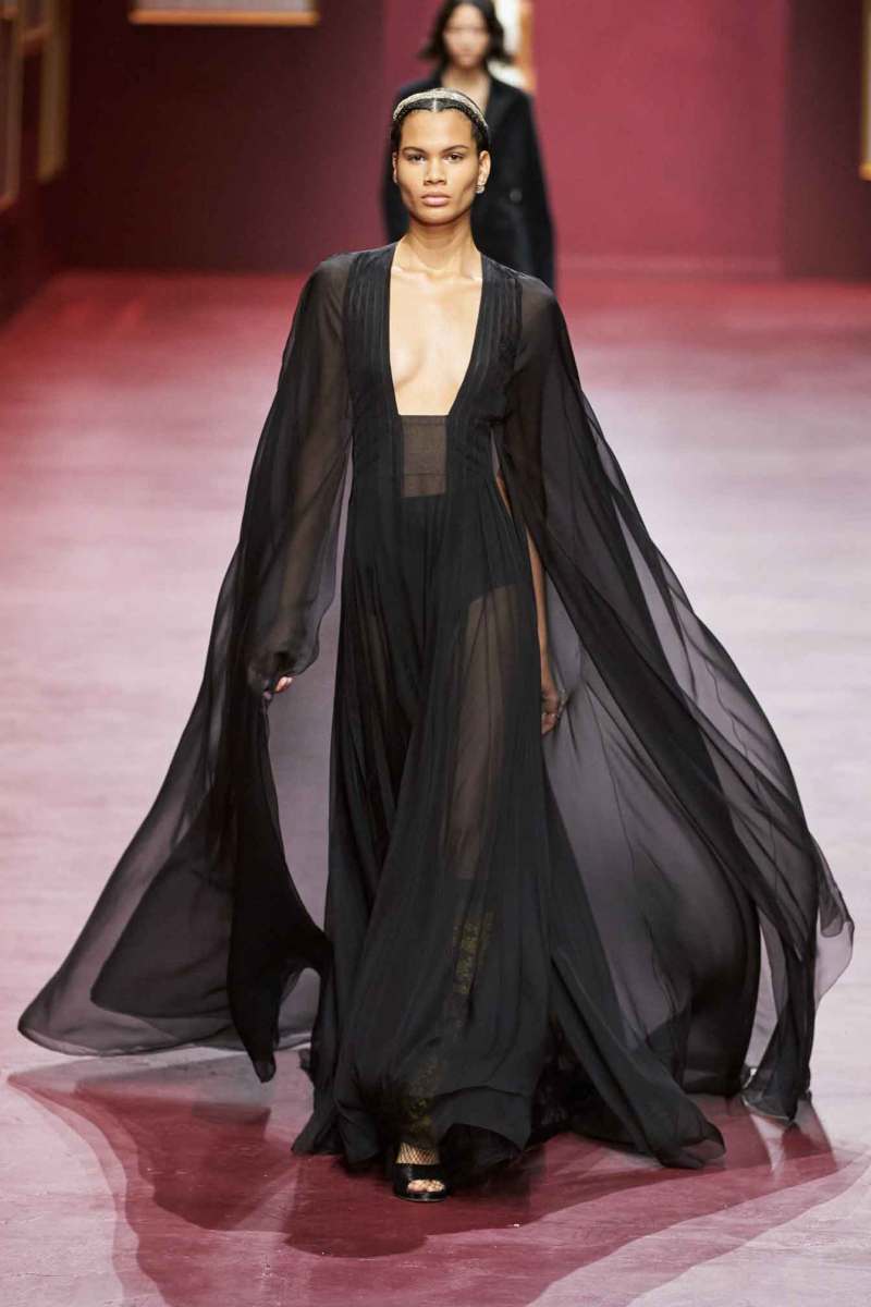 La sfilata si chiude con sette abiti da sera, eterei nelle loro trasparenze e nella loro leggerezza, che ci riportano all’intramontabile ed essenziale eleganza tipica del marchio francese.