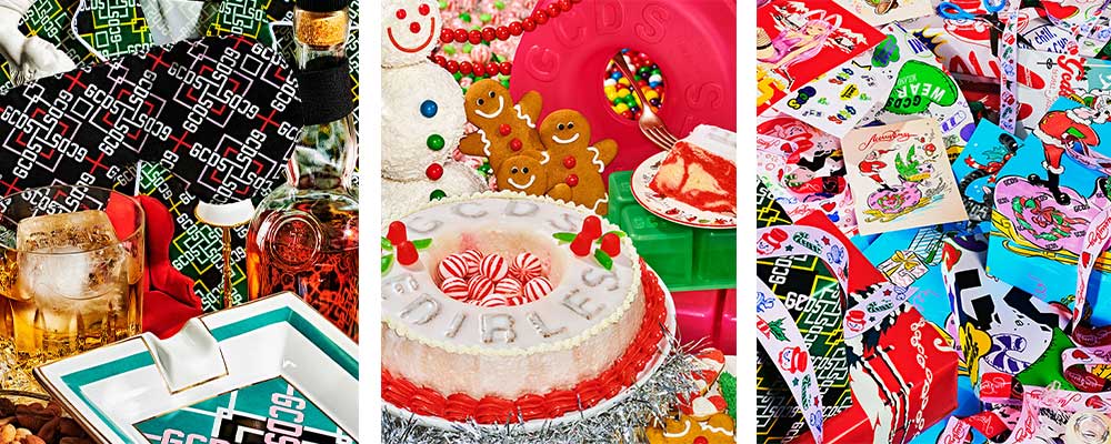 Per i più ironici GCDS crea invece la box EDIBLES con una t-shirt stampata, un vassoio per cubetti di ghiaccio e uno stampo per torte. Poi, LOGO LOUNGER, per i più classici, include un pigiama, un posacenere e una mascherina da notte con un motivo anni Sessanta. Si prosegue con la box WRAP IT UP, per i più creativi, con articoli personalizzati per incartare regali. Infine, il kit HAPPY SOCK-MAS include le classiche calze a coste con logo.