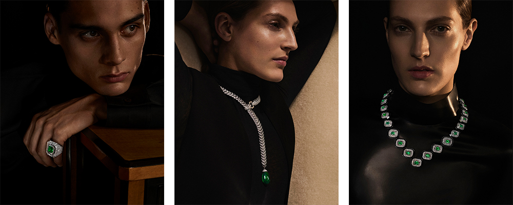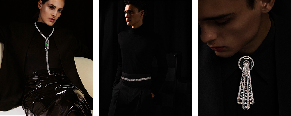Ecco quindi un succedersi di materiali preziosi ed energici, colori basici ma mai banali: l’eleganza del classico bianco e nero è accompagnata dalla vitalità e delicatezza del verde smeraldo. È una collezione d’impatto, in cui storia e contemporaneità si fondono perfettamente. D’altronde, il salto nel passato è percepibile nelle forme classiche e simmetriche dei gioielli, semplicemente perfette, ma Boucheron rimane con un piede ben saldo nel presente, come dimostra la scelta dei gioielli multiwear e genderless. Sono tanti gli esempi: il Ruban Diamants, ovvero una treccia di oro bianco utilizzabile come cintura da uomo su smoking, cerchietto, o addirittura collarino da donna; un papillon in diamanti diventa, all’occorrenza, una spilla da smoking, un fermaglio per acconciature o, ancora, un anello. Insomma, l’unico limite alle possibilità di impiego di questi gioielli è rappresentato dall’immaginazione.