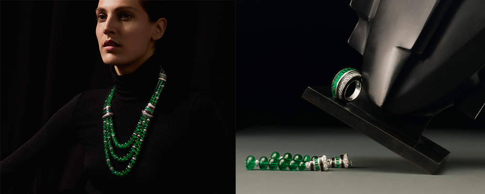 La cravatta, capo maschile per eccellenza, viene ripensata in forma di gioiello in Cravate Émeraude, una collana in oro bianco chiusa da una spilla removibile realizzata con uno smeraldo zambiano da 8,02 carati su un pavé di diamanti. Indossabile come cravatta o collana, lo smeraldo stesso diventa removibile e opponibile su un altro gioiello. Lo stesso pensiero si nasconde dietro a Lavallière Diamants, altro pezzo che ricorda la cravatta, indossabile come collana, collarino o fermacravatta, oppure si può scomporre a ottenere degli anelli. La designer non si limita a rievocare l’Art Déco, ne celebra anche il contesto parigino. Con l’impiego di 28 smeraldi, per un totale di 24,59 carati, il Col Emeraudes rievoca la maestosità di Place Vendôme, grazie al design che ne richiama la forma e il motivo a ciottoli.