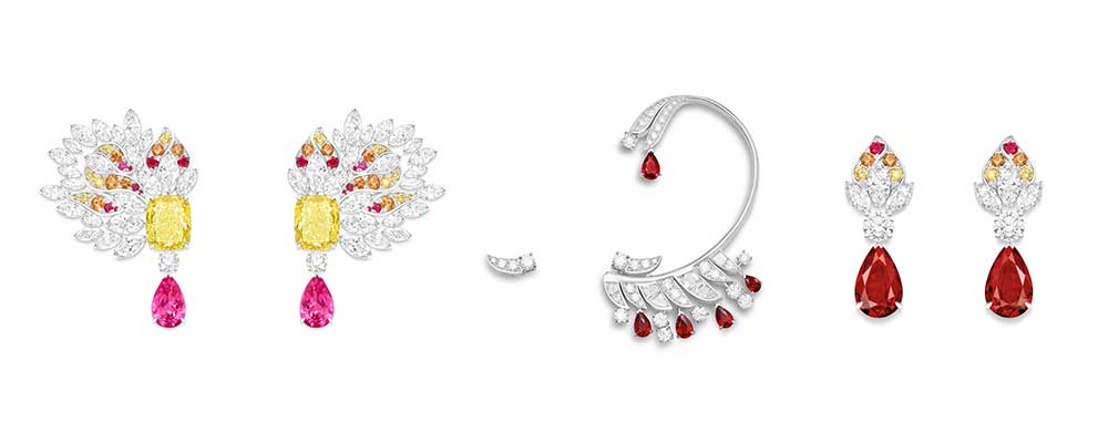 Il collier Extraordinary Lights è completamente snodato ed è tanto confortevole da indossare quanto affascinante da ammirare. Uno spettacolare diamante taglio coussin del più pregiato colore giallo Fancy Vivid è abbinato a uno zaffiro blu dello Sri Lanka a goccia di 5,34 carati e a uno spinello rosso della Tanzania, sempre a goccia, di 3,61 carati. Garantendo la massima versatilità, il sensazionale design low-back può infatti essere trasformato e indossato in ben sei modi diversi. Grazie ad un eccezionale livello di creatività, il collier ha la capacità di trasformarsi da gioiello “da giorno” a perfetto gioiello “da sera”. La combinazione di colori si ripete negli orecchini della stessa parure, mentre l’anello abbinato vanta un diamante centrale giallo Fancy Vivid.
