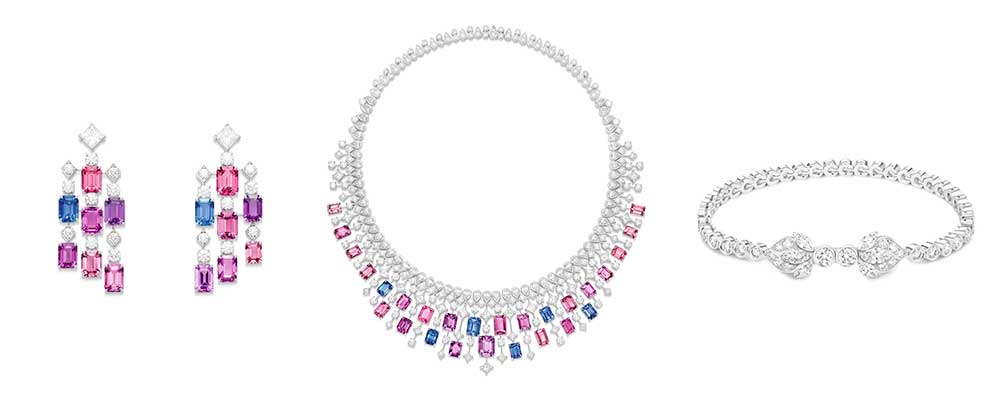 La cascata di 27 zaffiri del collier Gloaming Illuminations è una straordinaria collezione di progressive sfumature naturali che ha richiesto più di due anni per essere completata con una perfetta corrispondenza di dimensioni, tonalità e qualità. Vi sono anche tre pietre padparadscha con le loro ricercatissime sfumature rosa salmone o arancione acceso in una fusione perfetta di nuances raramente osservata in natura.