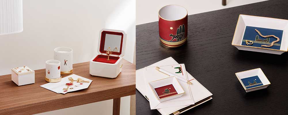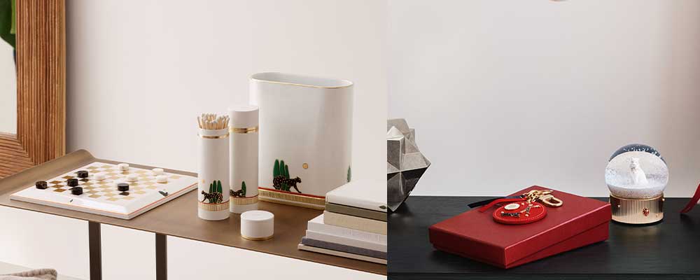 Questi oggetti di stile, caratterizzati dai motivi a nastro intrecciato o dalla tipica e iconica pantera Cartier (che contraddistingue sin dal 1914 le creazioni della casa parigina e che ormai è entrata nella leggenda del marchio), vengono riproposti su una collezione dai contrasti marcati: bianco e nero, verde, rosso e blu. Oggetti raffinati, che presentano quel tocco extra al fine di renderli lussuosi elementi d’arredo. Una collezione di oggetti in porcellana Biscuit, come svuotatasche e vasi, o in legno laccato, come il set da dama con pedine in marmo.