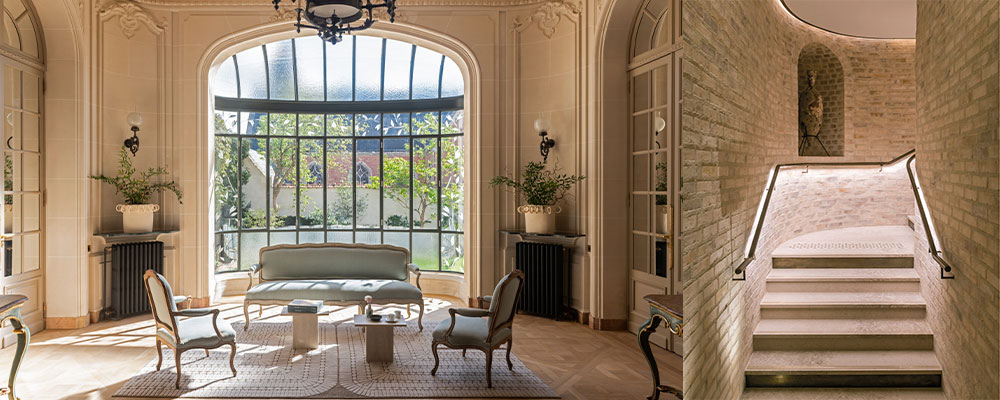 L’esterno del palazzo è in stile neo-Luigi XVI e fonde in modo eclettico motivi settecenteschi e ispirazioni Art Nouveau e Art Déco. All’esuberanza della facciata, decorata con ghirlande e fiori, si contrappone l’eleganza più composta degli interni, connotati dall’ampio impiego di legno, marmo, preziose vetrate e dettagli in ferro battuto. Le stanze da letto sono tutte diverse e ognuna di loro riecheggia il passato ricco di storia di un luogo unico.