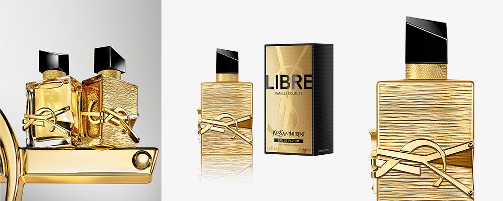 A esaltare la ricchezza di Libre Vanille Couture, il flacone firmato Suzanne Dalton, più prezioso che mai, rivestito in uno dei materiali più emblematici di Monsieur Saint Laurent. Interamente in oro metallico brillante e materico, avvolge le linee nette del design iconico, mentre i lati in vetro trasparente svelano la tonalità dorata della fragranza. Il logo YSL Cassandre dorato, piegato ad angolo e fissato al vetro – un vero capolavoro di ingegneria – aggiunge un ulteriore tocco couture. Un ulteriore dettaglio luminoso: una V di vetro intagliato sottolinea la scollatura della Y, scolpita in profondità. A completare, un tocco di asimmetria couture: il tappo nero inclinato che sigilla il flacone e valorizza la sottile catena dorata avvolta attorno al collo.