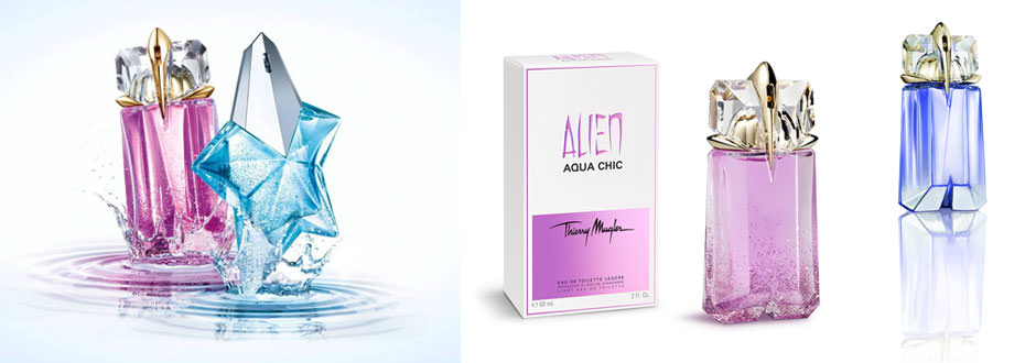 Gli intramontabili profumi firmati Mugler diventano così delle limited edition per questa primavera-estate, con variazioni aromatiche intriganti e sensuali per un’emozione olfattiva decisamente “effervescente”. Il mix patchouli-vaniglia di Angel acquista così la leggerezza dell‘acqua di rose in un cuore che rivela la freschezza del lampone e della granita di mela, mentre Alien si colora del fiore d’arancio che abbraccia con le sue note amare il gelsomino del Marocco, il pompelmo rosa e l’ambra bianca. L’edizione Acqua Chic reinventa entrambe in chiave fresca e briosa e li “illumina” non solo nel cuore del profumo, ma anche nei flaconi che si impreziosiscono di un effetto specchiato sui toni del blu e dell’argento per la classica stella di Angel, e di un affascinante effetto degradè color ametista e gold per Alien.