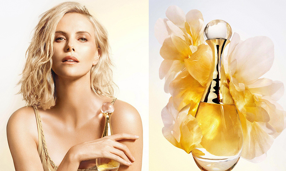 Ad accompagnare L’Or de J’Adore è Charlize Theron, luminosa e femminile, che stringe a sé il flacone dorato, avvolta in un abito in crêpe di seta dai riflessi anch’essi oro, disegnato da Maria Grazia Chiuri in esclusiva per lei, senza gioielli né trucco, lasciando che sia la preziosità dell’oro a farla risplendere.