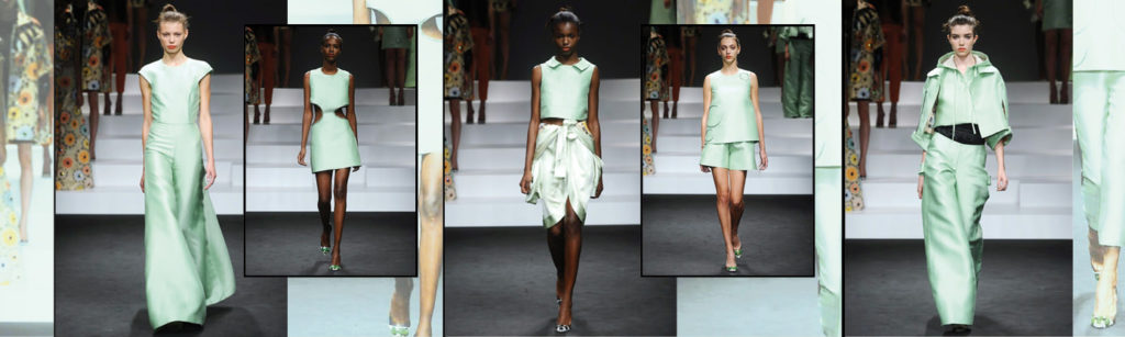 Alberta Ferretti propone una nuova donna in equilibrio tra contrasti cromatici e femminilità.