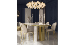 Il tavolo da pranzo Ophelia unisce il lusso del marmo e dell'ottone a un design moderno, trasformando ogni sala in uno spazio sofisticato. Perfetto