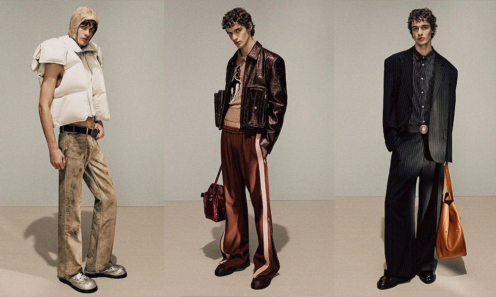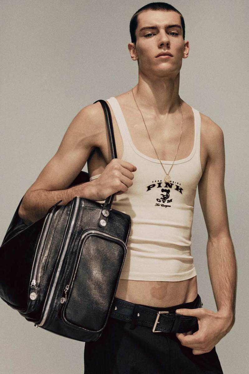 Tra i look presentati, i crop top con scollature profonde hanno reinterpretato la sensualità maschile, rompendo con gli stereotipi di genere. I pantaloncini boxer strutturati, indossati sotto trench fluidi e cappotti oversize, hanno dato vita a un interessante gioco di volumi. E non sono mancati accessori insoliti: borse oversize dalla silhouette a forma di fotocamera, integrate nei capi stessi, hanno aggiunto un tocco surreale, ma perfettamente in linea con l’estetica del brand.
