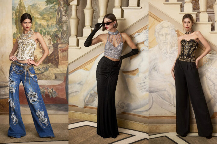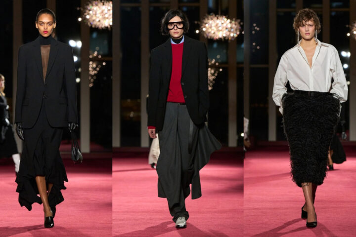 I colori raccontano una stagione intensa: nero, carbone e beige dominano la scena, intervallati da accenti più luminosi. I tessuti giocano con la texture, seta, velluto e maglieria strutturata, creando un contrasto tra opacità e riflessi. La materia diventa protagonista silenziosa, dando carattere ai capi senza bisogno di eccessi decorativi.