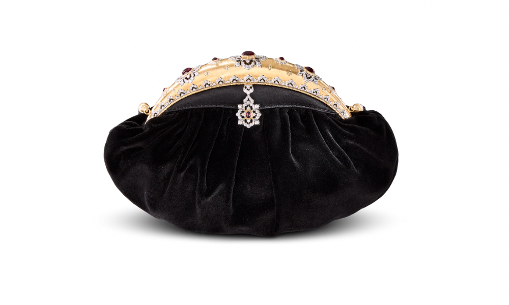 Oggi la storia si rinnova con tre borse gioiello che incarnano l’essenza della Maison. Una trousse rettangolare in velluto verde, matelassé e impreziosita da una rubellite cabochon. Una seconda, in velluto nero, che cela una chiusura decorata con diamanti e rubelliti, completata da un pendente Opera che sembra danzare con la luce. E infine, la più audace: una borsetta sferica, in velluto elasticizzato, ornata da brillanti e sorretta da un manico in oro giallo, icona di modernità e coraggio stilistico. Tre interpretazioni, una sola anima.