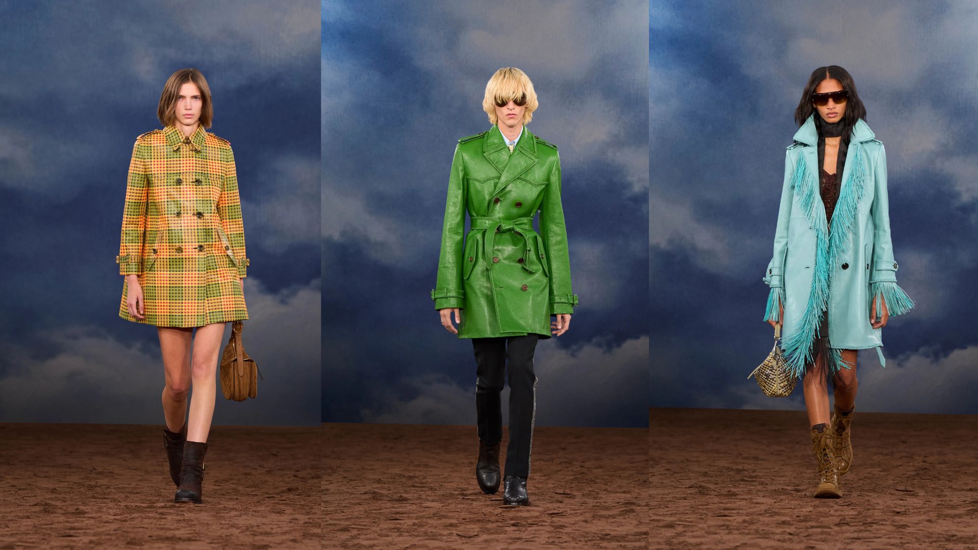 Accanto alla sperimentazione, la maison riafferma la sua anima sartoriale con giacche a tre bottoni e doppiopetto in lana o denim, combinate a pantaloni slim e camicie gessate in popeline, a cui si aggiungono cravatte di seta a quadri che richiamano l’iconico Burberry Check. I trench, simbolo eterno del brand, trovano nuova vita accanto a intrecci di macramè o in versioni ibride in cotone e rafia, sempre arricchiti da tocchi cromatici accesi. Le borse raccontano un’eleganza destrutturata e versatile: la Hampstead in pelle rifinita con zip e le Bridle con manico equestre segnano un passo verso un lusso pratico, mentre le calzature spaziano dai sandali Baez agli stivali Ledger, pensati per evocare un’equilibrata fusione di urbanità e tradizione.