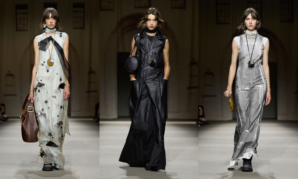 Coach SS26 è costruita sul dialogo tra il vissuto e il lucido: il cuoio invecchiato, le giacche di jeans sdrucite, i pantaloni con orli sfrangiati, tutti elementi che portano con sé una storia, un’imperfezione che diventa bellezza. E poi accanto, blazer checkati dal taglio classico, pelle suede nuova, dettagli metallici che brillano come piccoli lampi sotto il cielo mattutino. Le silhouette mostrano una dualità: la parte superiore è precisa, controllata, quasi composta; la parte inferiore si espande, si allunga, ondeggia, accompagnata da pantaloni larghi, gonne morbide o overture tessili che fluttuano.