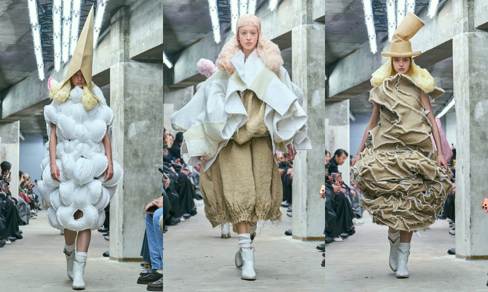 La ricerca materica è, come sempre, radicale. Stoffe grezze come burlap, calicò, lino ruvido e jersey destrutturato convivono con tessuti lucenti, quasi cerimoniali. L’effetto è un continuo contrasto: la rudezza della superficie incontra la precisione del taglio, la povertà del materiale si trasforma in gesto di purezza. La palette resta essenziale, bianco, nero, terra, grigio, perché qui non si tratta di decorare, ma di esprimere. In passerella si respira un’energia rituale: ogni silhouette è una piccola scultura che sembra costruita con la stessa intensità con cui si scolpisce un pensiero.