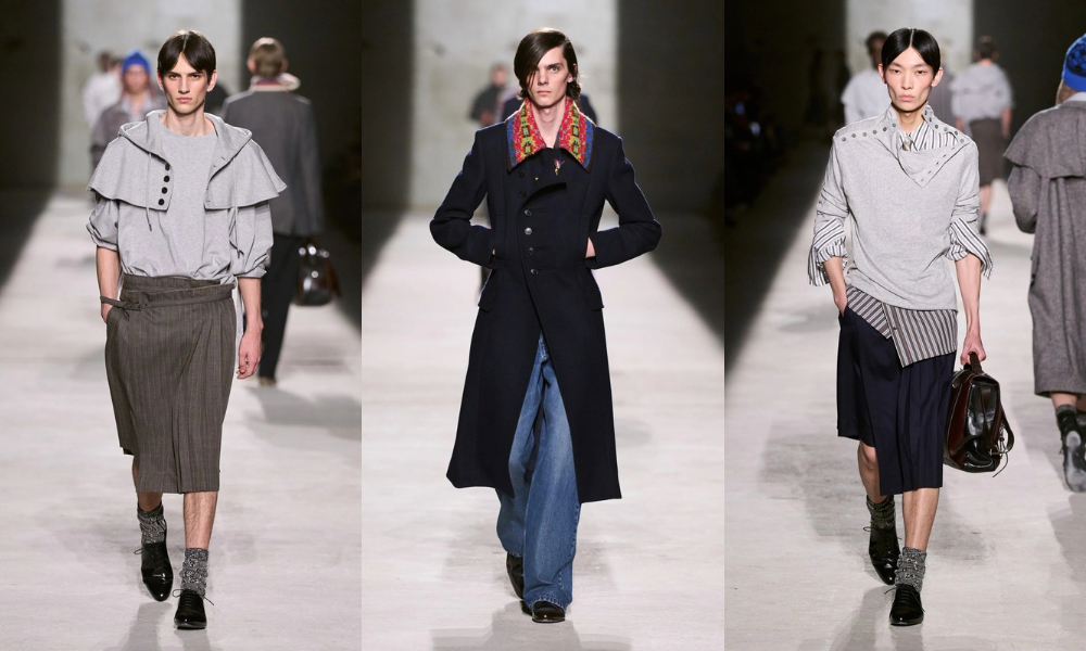 La proposta di Dries Van Noten si concentra sull’idea di un uomo in transizione, di una figura che si evolve passo dopo passo. Ogni capo sembra raccontare un momento di crescita personale e stilistica: dai capispalla alle maglierie, l’attenzione è rivolta a proporzioni che evocano movimento e trasformazione. La narrativa immaginata da Klausner riflette una fase di scoperta e di esplorazione, quasi come un viaggio verso l’autonomia e l’identità.
