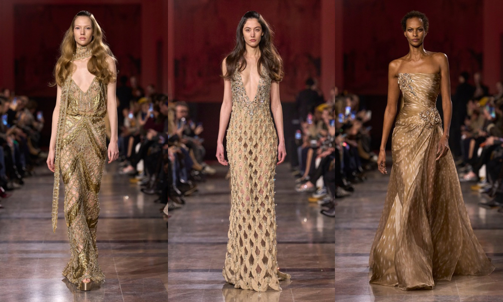 Alla Paris Haute Couture Fashion Week, Elie Saab presenta la collezione Haute Couture Primavera-Estate 2026, intitolata Golden Summer Nights of ’71. È un racconto cinematografico che prende vita al chiaro di luna, tra musica, risate e bagliori di fiamme sulle pietre, evocando il glamour sensuale delle notti estive del jet-set anni Settanta.