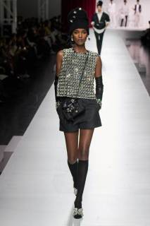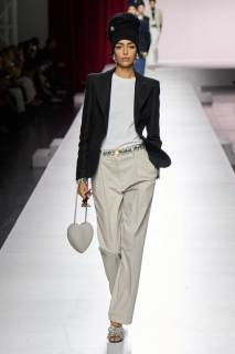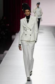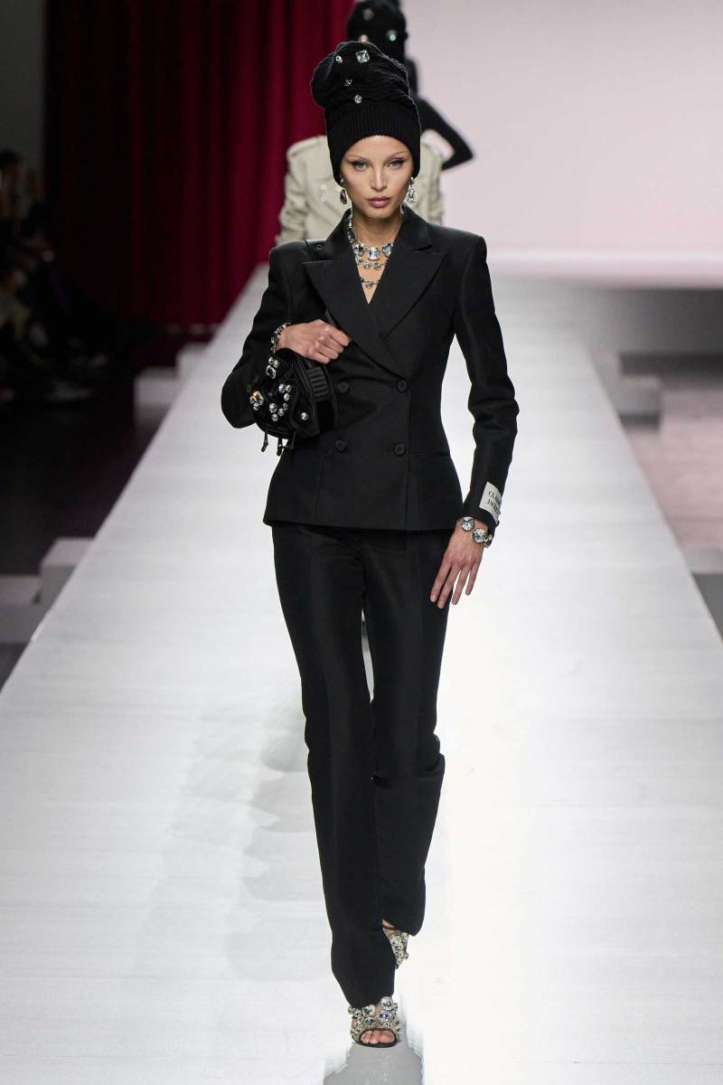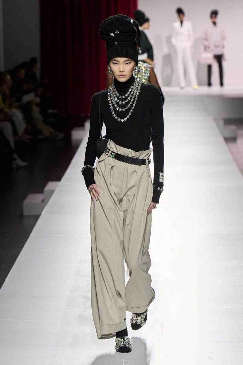 Tanta ironia ma anche tanta serietà quando si trattava di sartorialità è quello che ha accentuato Carlyne Cerf de Dudzeele con i suoi 10 look che hanno dato il via allo show. Capi essenziali di un guardaroba donna, come un tailleur con giacca a doppiopetto bianco, un trench beige, un blazer nero, pantaloni di diversi fit ma sempre in toni neutri, impreziositi da collane composte da grossi swarovski applicati anche sui maxi berretti neri indossati da tutte le modelle. Less is more.