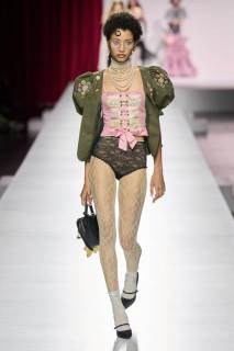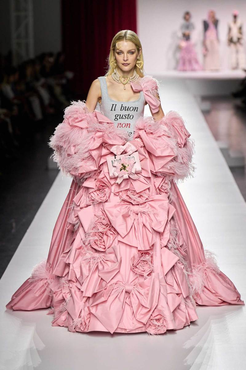 Al terzo atto la donna in carriera e seducente cede il passo alla femminilità frivola ma pungente della lettura di Moschino da parte di Lucia Liu, che con i toni soft del rosa e del grigio richiama quello stile Maria Antonietta visto sotto la firma di Jeremy Scott. Corsetti, rouches, spalline, guanti e un tripudio di fiocchi che trionfano in quello che sembrava il perfetto finale d’effetto, con la citazione moschiniana: “Il buon gusto non esiste”.
