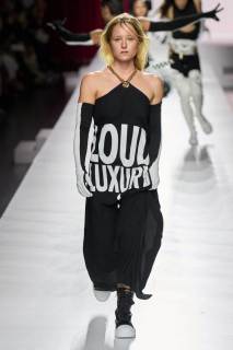 Il gran finale dell’inglese Katie Grand ha messo i puntini sulle i e i punti esclamativi e interrogativi addosso a un corpo di ballo che si è scatenato a ritmo techno definendosi attraverso le sue t-shirt i paladini di un lusso rumoroso. Le coreografie erano di Wayne McGregor, Resident Choreographer al Royal Ballet e direttore della Biennale Danza di Venezia. A riportare la pace e chiudere il sipario Laura Marzadori, primo violino del Teatro alla Scala che interpreta I’m What I’m di Gloria Gaynor e l’uscita delle modelle in jeans e t-shirt bianca con su scritto Borrow Me-Wear Me-Hug Me in supporto di Elton John AIDS Foundation.