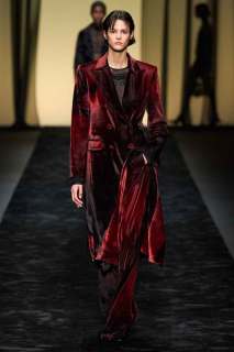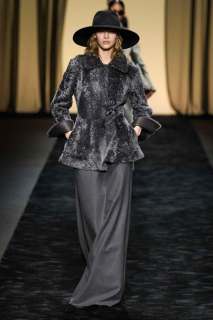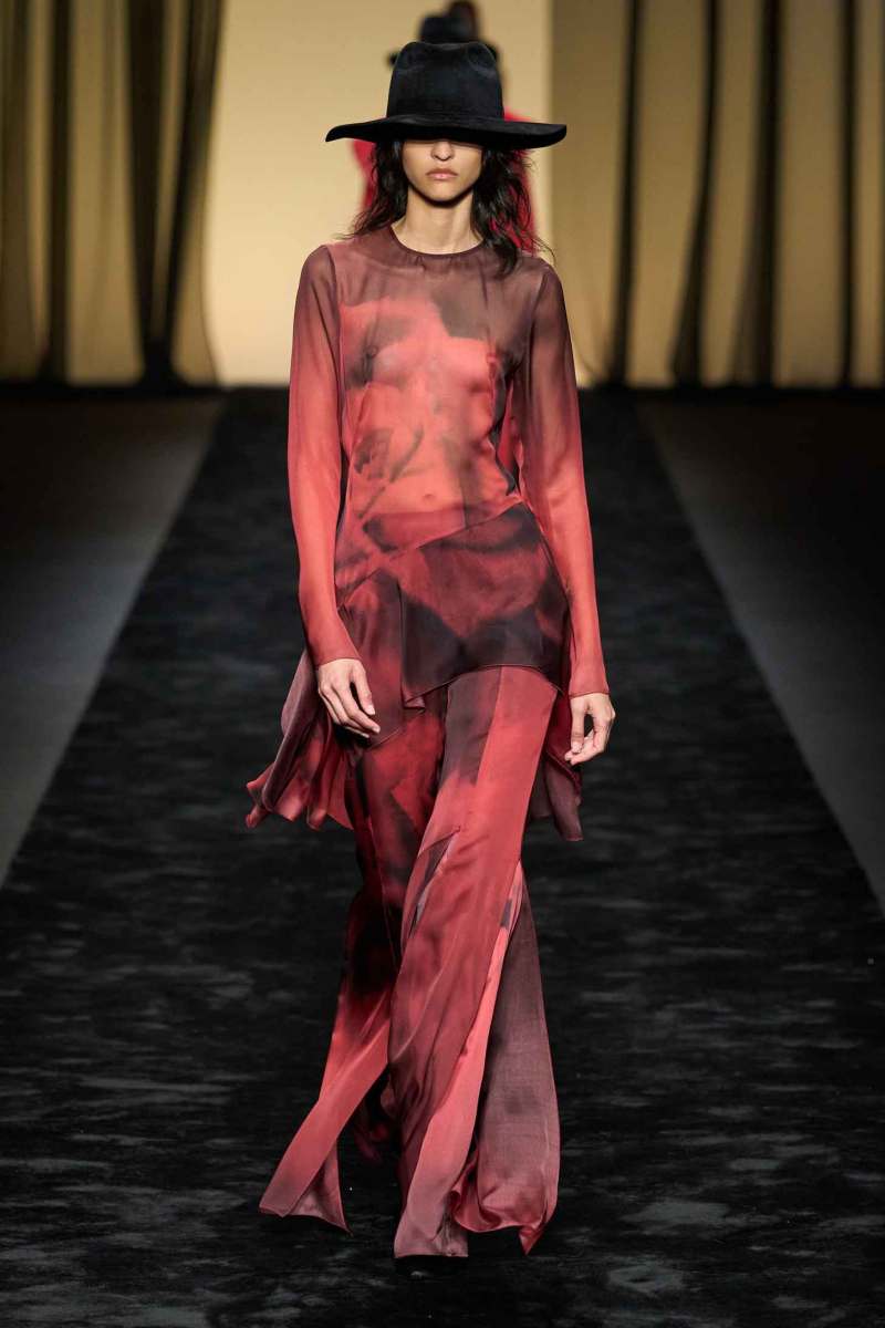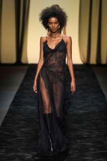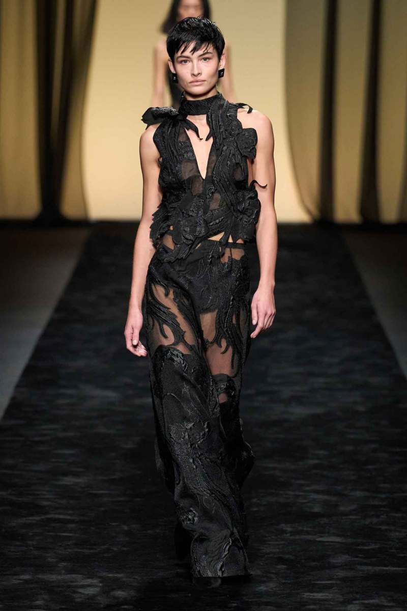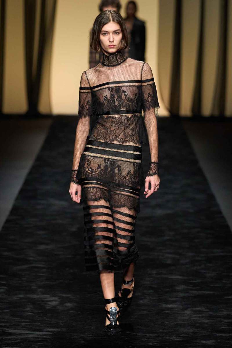 La collezione è costituita da un’intima unione tra capi dichiaratamente femminili come sottovesti, tailleur, abiti trasparenti, tuniche di velo e cappotti di shearling, e tailoring maschili. Sapiente il gioco di materiali che spaziano da pizzi, velluti, lane, chiffon, devorè e macramè.