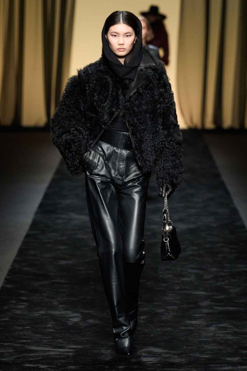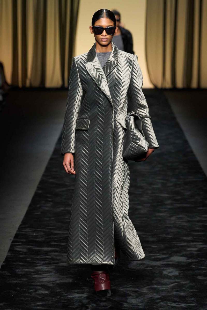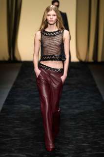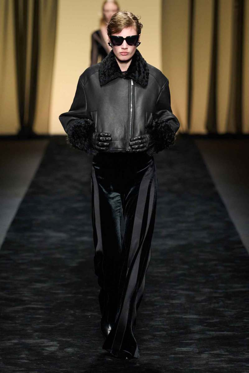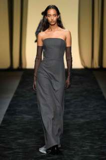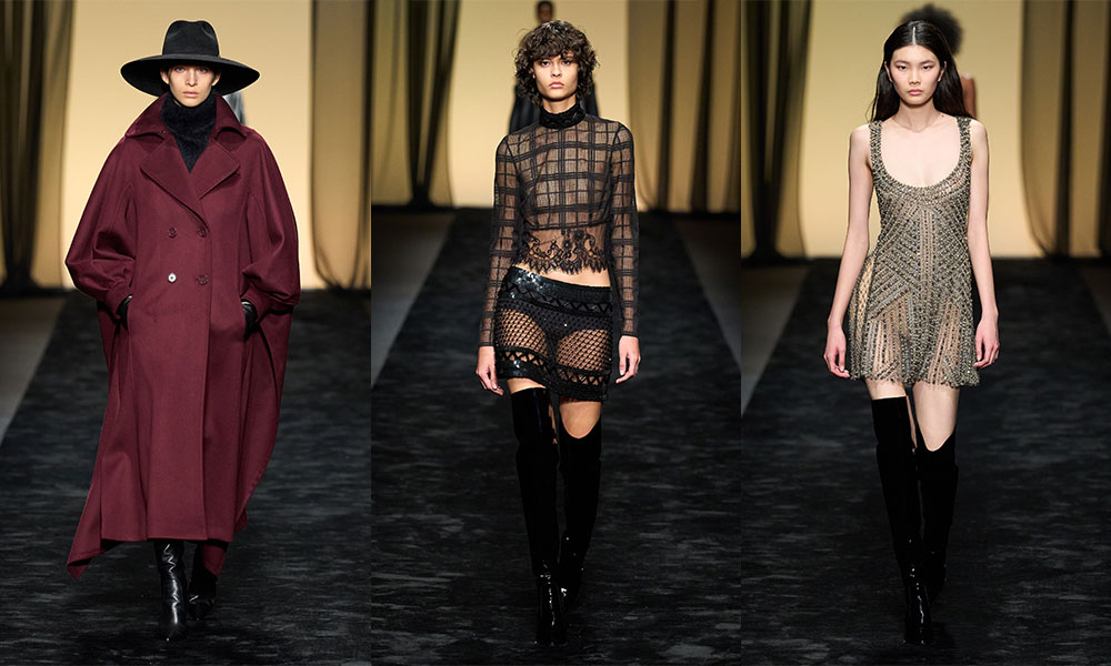 La collezione è costituita da un’intima unione tra capi dichiaratamente femminili come sottovesti, tailleur, abiti trasparenti, tuniche di velo e cappotti di shearling, e tailoring maschili. Sapiente il gioco di materiali che spaziano da pizzi, velluti, lane, chiffon, devorè e macramè.
