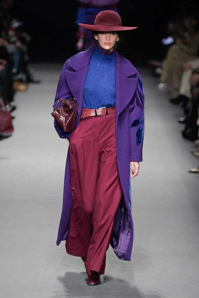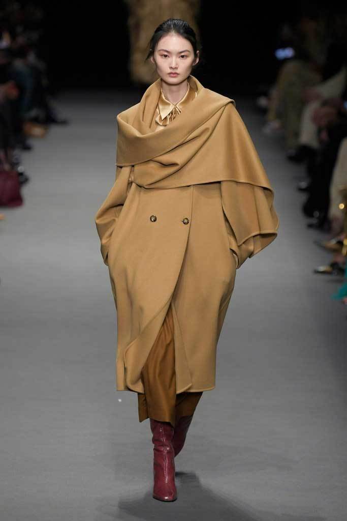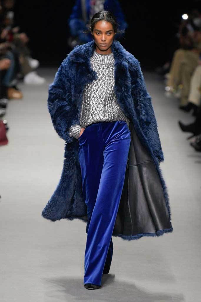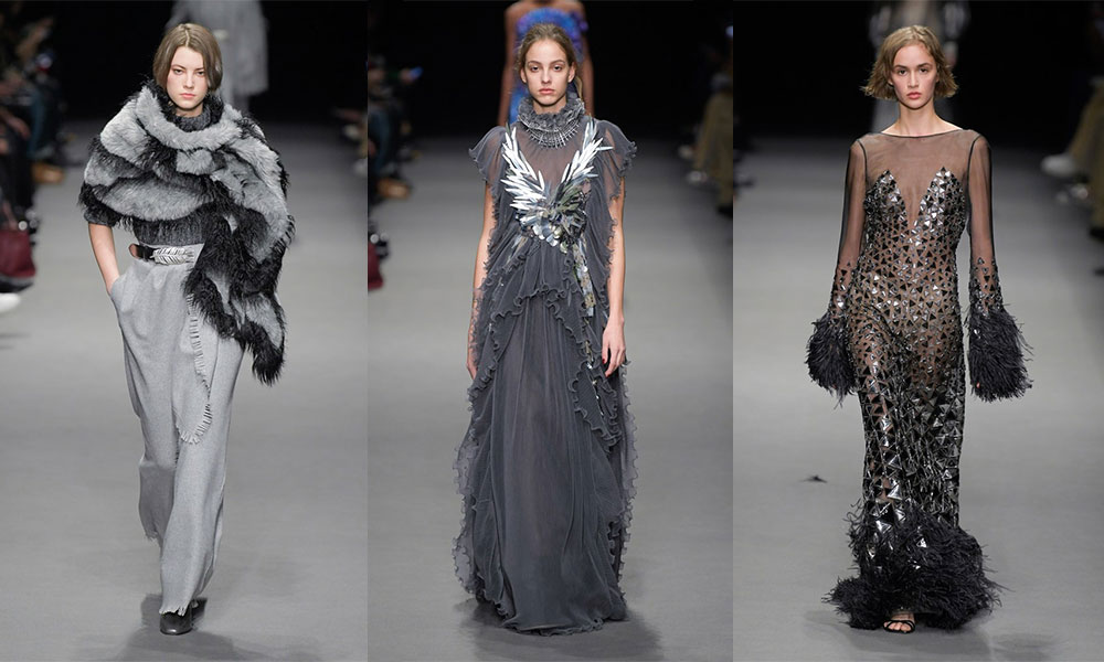 Dall’abito in maglia grigia lavorato a trecce, alle stole di lana folta, fino ai cappotti con le stampe istoriate, alle gonne diritte movimentate da drappeggi e grossi maglioni dalle superfici laccate indossati con ampi pantaloni maschili. E poi ancora, folti inserti di frange in lana che movimentano superfici di abiti e cappotti che ci proteggono e avvolgono, fino al pizzo che doppia abiti in chiffon trasparente. La luminosità è tessitura di contrasti materici e cromatici: panni, feltri, faux fur e lane opache, e poi lurex, chiffon crudi, satin luminosi in una palette di grigi metallici, neri, cammello con tocchi di ametista e rosso denso.