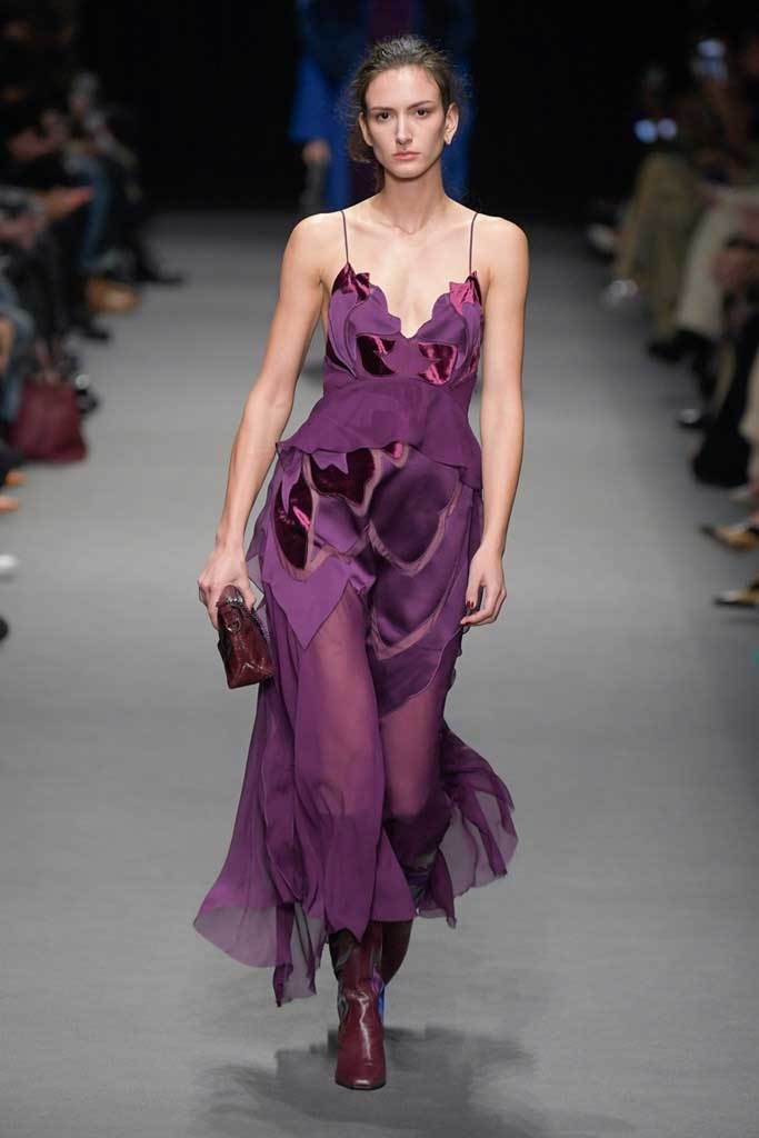 Quella di Alberta Ferretti è una collezione che racconta di un romanticismo consapevole illuminato dalla luce fredda, quella che arriva dalla luna, con i suoi grigi, le sue referenze glaciali e la freddezza del bagliore. Al centro della scena ci sono i riflessi e bagliori che si riflettono su tessuti cangianti; lurex e lamé su abiti da giorno in maglia lavorata a trecce e abiti da sera increspati dal plissé di tessuti brillanti. Tutta questa luminosità dà ad Alberta Ferretti l’occasione per costruire una collezione che riscopre un’idea romantica della vita e del guardaroba.