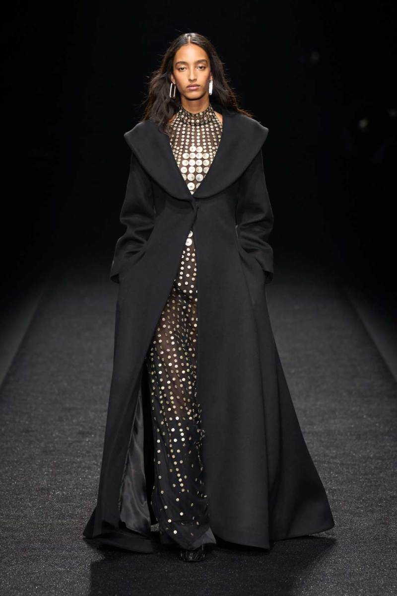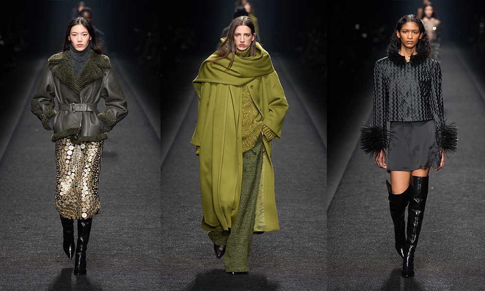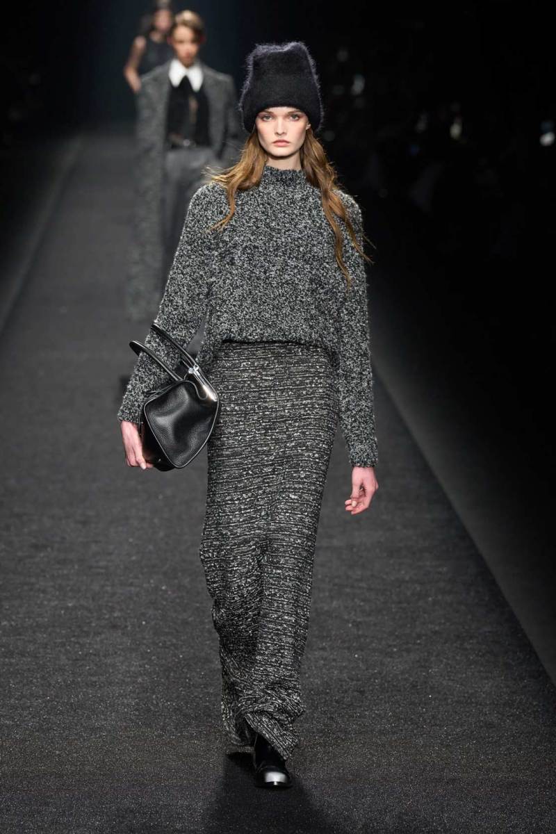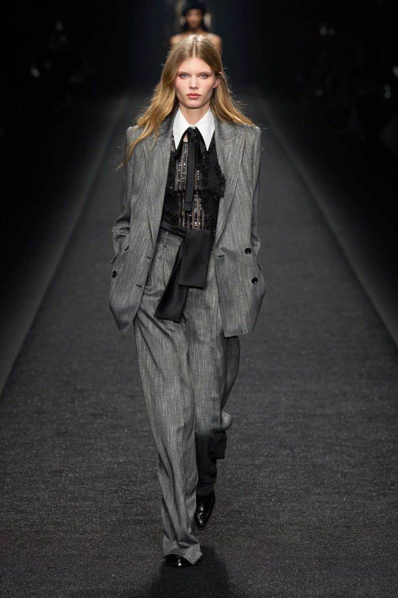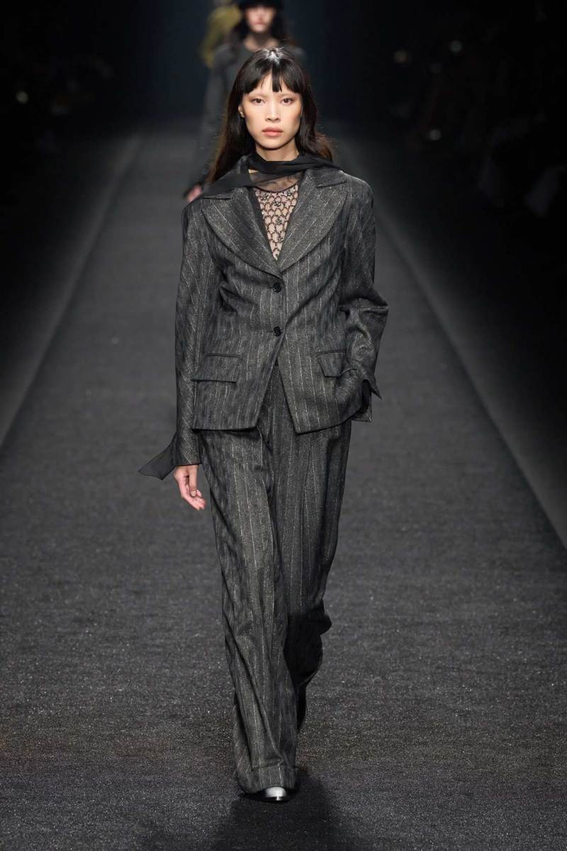 Elementi mascolini si fondono ad elementi femminili. Gli abiti e i tessuti sobri pensati per i look da giorno si contrappongono alla lucentezza dei ricami in paillettes che impreziosiscono gli abiti per la sera. Un mix perfetto di solidità e leggerezza. Da un lato le leggere sottovesti, dall’altro i gessati e i cappotti avvolgenti. Sono i modelli a esprimere l’identità dell’abito; ciascuno può darne una personale interpretazione. Non è il capo che veste il modello, ma in qualche modo è il modello che dona significato profondo all’abito.