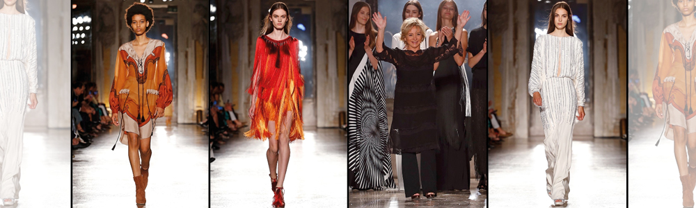 Workwear e comodità sono parole chiave per tutta la prima parte della sfilata in un susseguirsi di tute, abiti chemisier e ponchos nei diversi toni del verde e del marrone, per dei look un po’ da esploratrici del tempo perduto, un po’ da Pocahontas dei giorni nostri. Filo conduttore tra le due parti dello show, sono senza dubbio le frange. Se nella prima parte amplificano quello che può essere interpretato come un riferimento/omaggio ai nativi americani e al loro mondo inesplorato, nella seconda sembrano richiamare più dei moderni Roaring Twenties. Con la linea demi-couture Alberta Ferretti Limited Edition vanno infatti in scena morbidi abiti da cocktail in pieno accordo con lo stile della maison, in cui trasparenze e paillettes fanno da padroni.