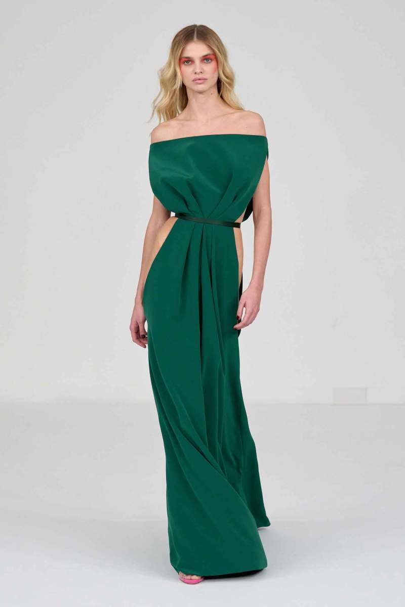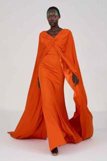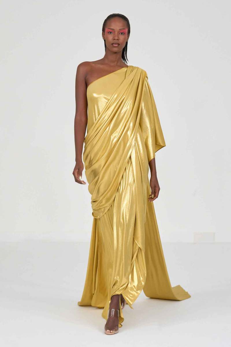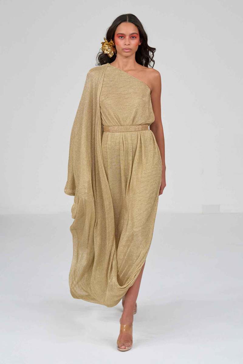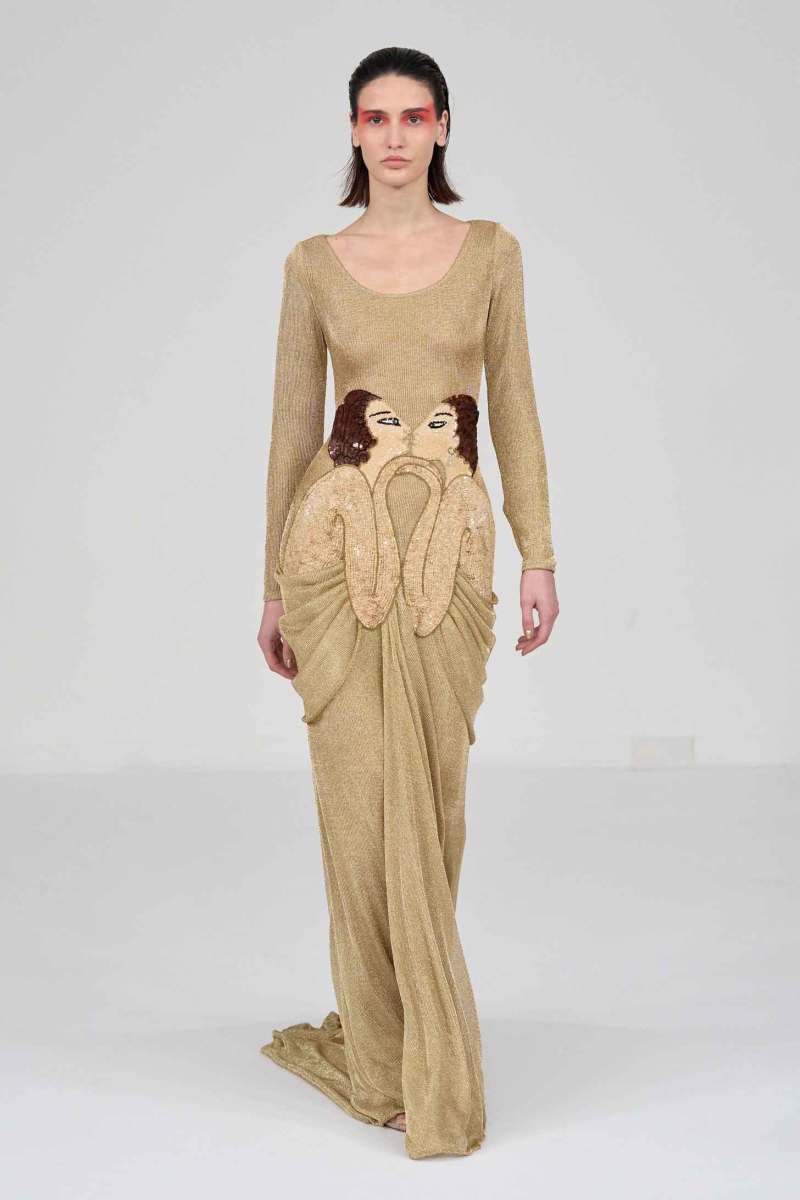 La collezione SS23 di Alexis Mabille stupisce per l’intensità dei colori, per la  reinterpretazione dell’abito da sera e per l’esagerazione del dorato, che viene esaltato dalla voce in sottofondo che ad ogni passo ripete “Money is success, fame, glamour“. Un lungo abito dai toni dell’oro con scollo asimmetrico apre la sfilata, lasciando poi spazio a un completo lamè con cappuccio, a un fourreau la cui parte centrale, ricamata a mano, mette in  luce i profili di due amanti, un evidente omaggio all’artista Ertè.