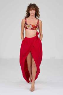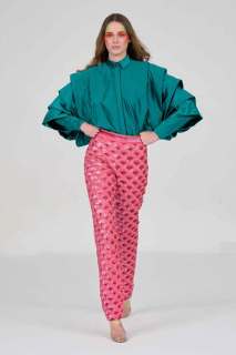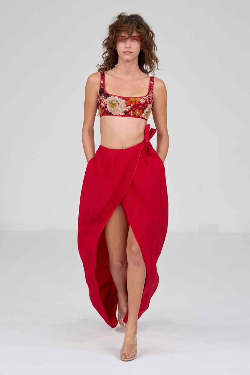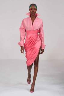 In un secondo momento, irrompono nella scena tono più intensi, colori vividi, pieni di energia e irruenza. La tavolozza dalle tinte forti viene sottolineata da un trucco altrettanto penetrante, opera del make-up artist Lloyd Simmonds. Abiti bustier dai drappeggi a cascata accompagnano il corpo catturando l’attenzione, tailleur da sera e brassière adornate da fiori trasmettono armonia e positività. La seduzione diventa un elemento centrale nella collezione SS23 firmata Alexis Mabille, dove forme e linee si mescolano, creando una sensazione di libertà e gioia.
