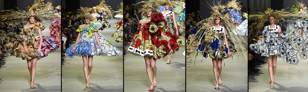 I cappelli – scultura, con paglia, giunchi e spighe, sono maestosi e si intrecciano agli abiti, anch’essi ricchi di applicazioni, facendo perdere la percezione di dove finisca uno e inizi l’altro. Le lunghezze dei vestiti sono esclusivamente mini e i colori sono vibranti, ottenuti con un particolare metodo di tintura batik inspired.