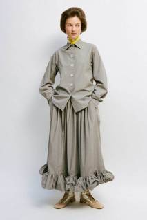 Quattro sono i pattern essenziali che caratterizzano la personalità della sfilata. Tra questi, una stampa fotografica creata con bicchieri trovati in vari luoghi, un dipinto astratto, una scacchiera dipinta ad acquerello, e una grafica originale realizzata in potato print technique. Le linee e i capi proposti nella collezione sono eleganti, sobri, raffinati.