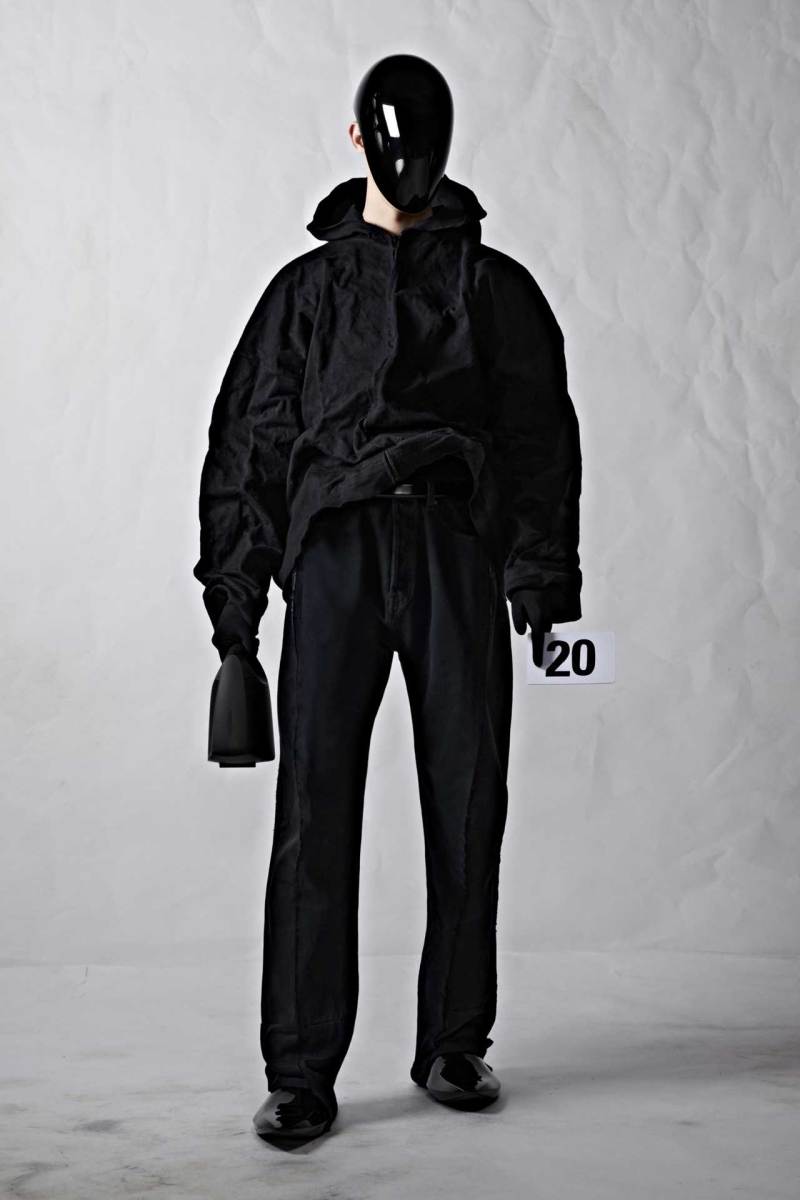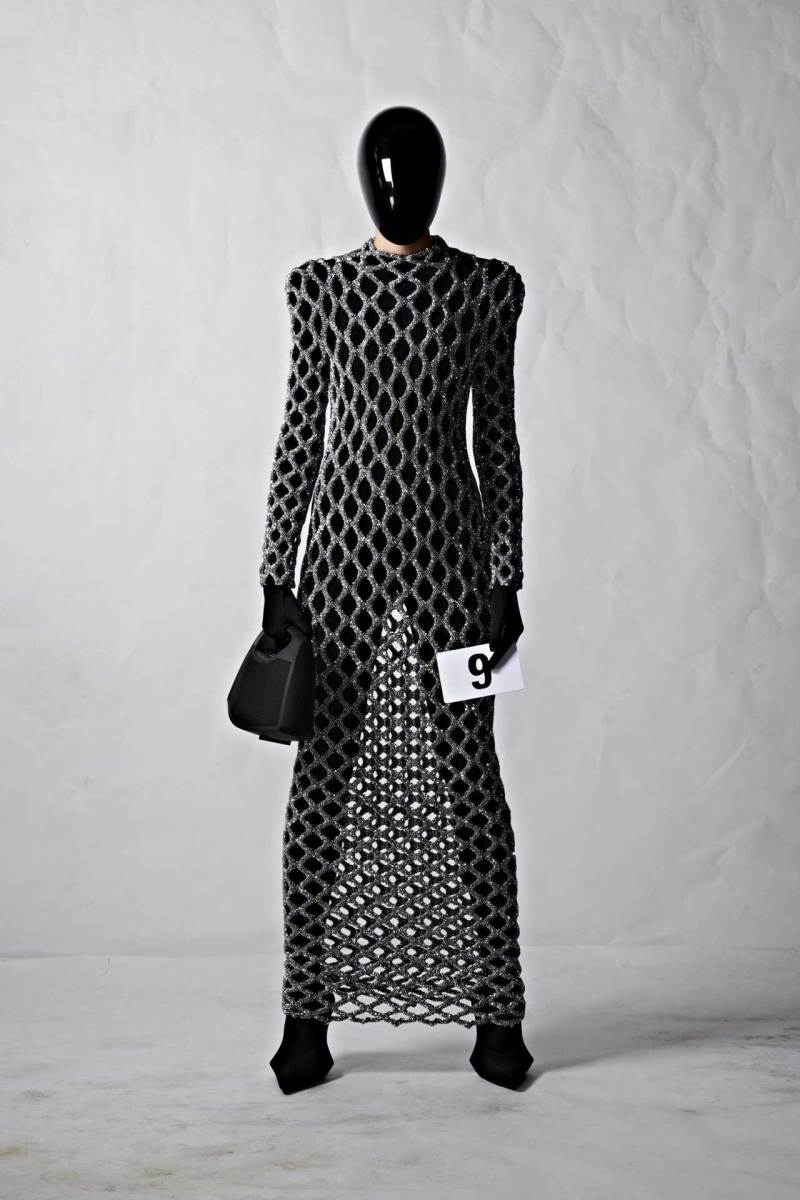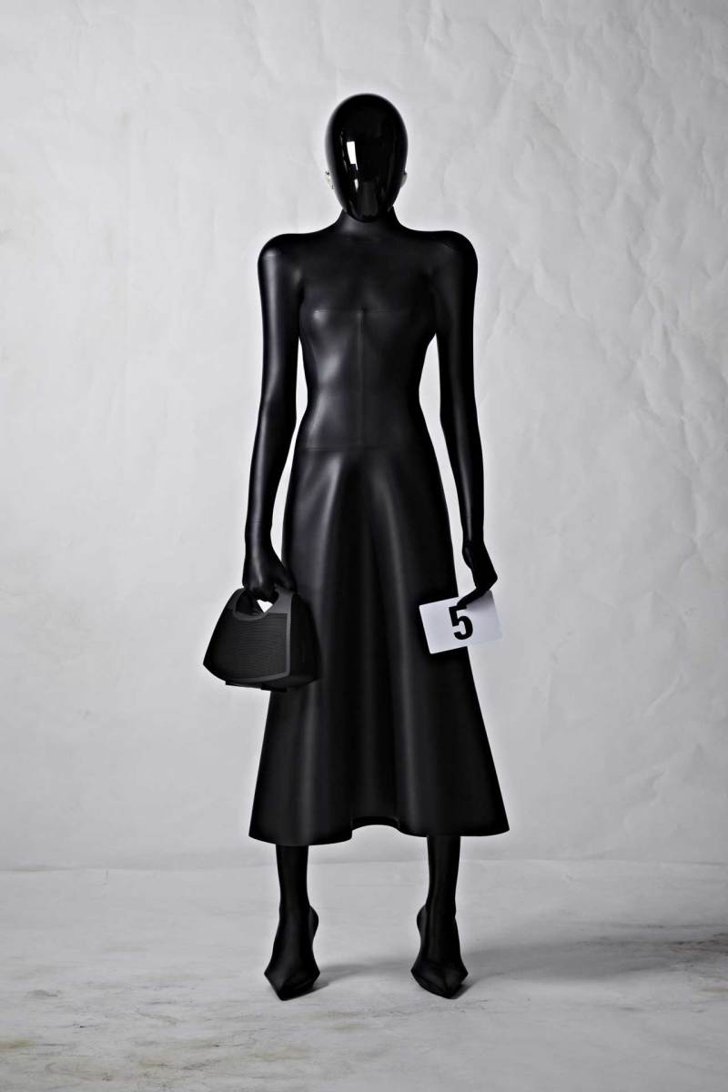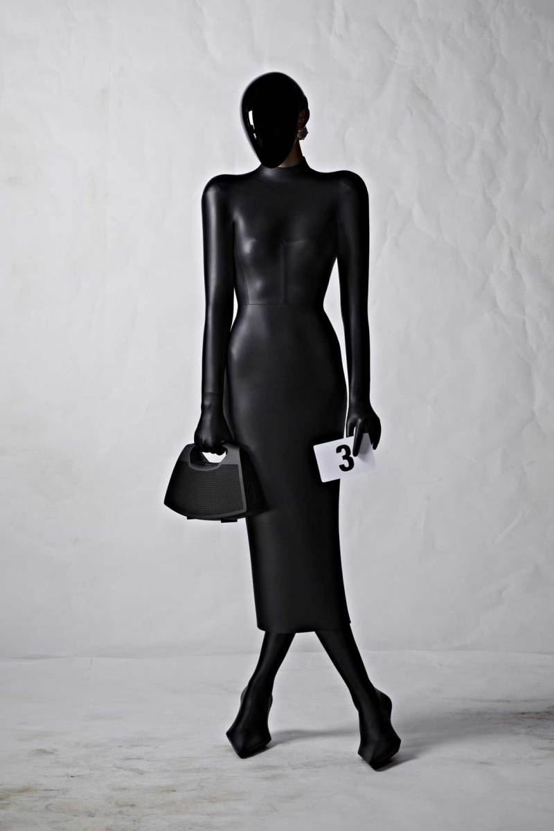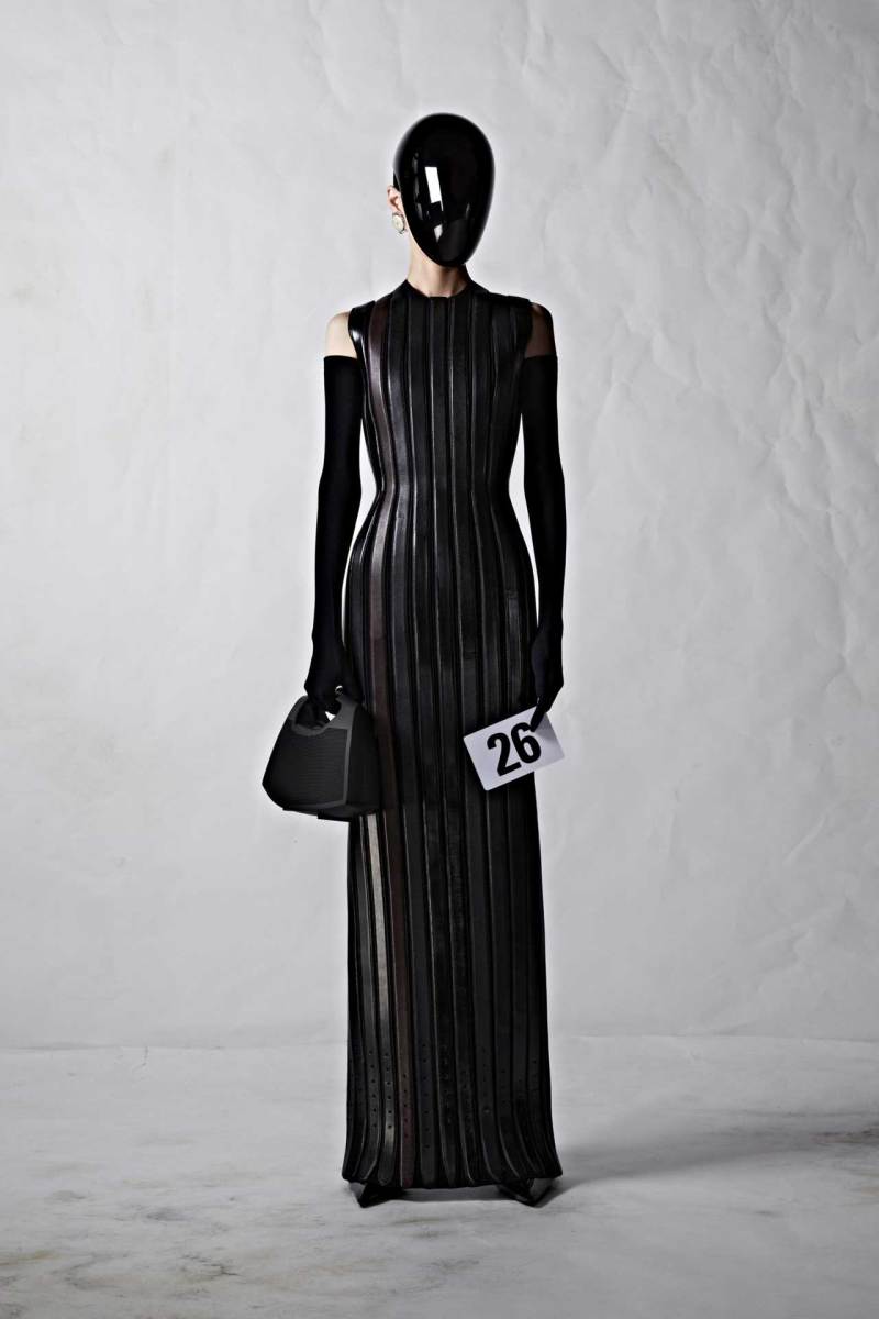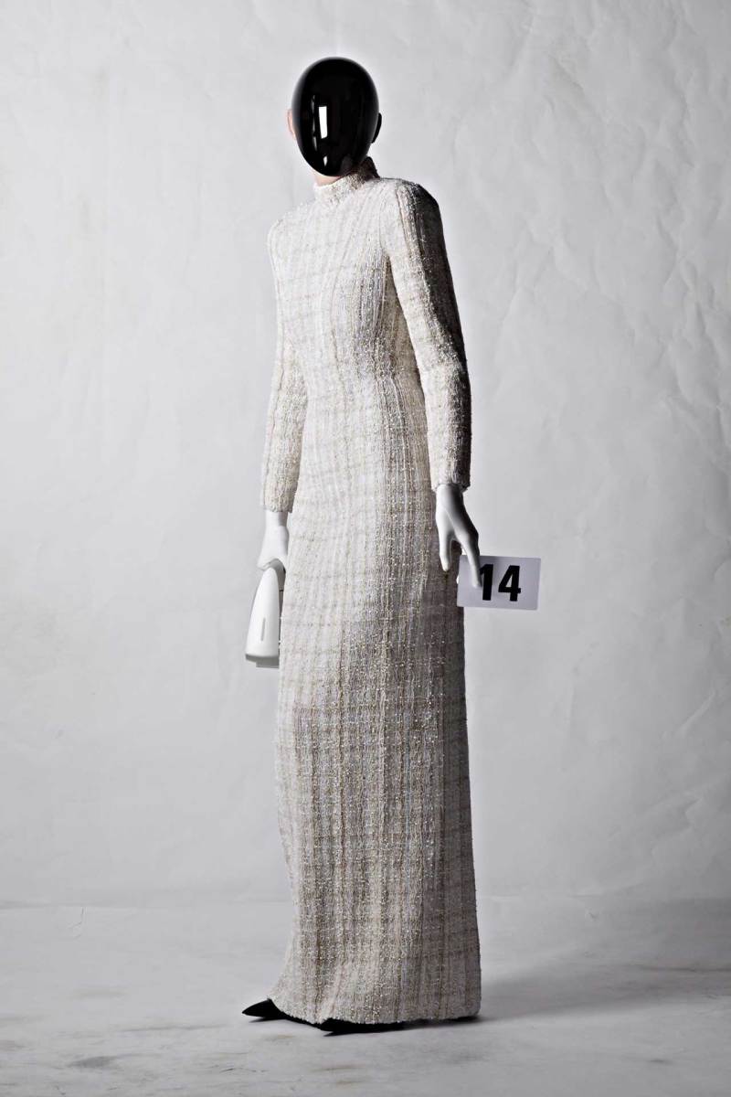Lo spettacolo inizia con tutti i modelli a volto scoperto che indossano abiti realizzati perlopiù in moderno neoprene, reminiscenza del tessuto Gazar di Cristobal, con al braccio le borse speaker realizzate con Bang&Olufsen. Tutti i materiali della collezione sono stati riciclati.