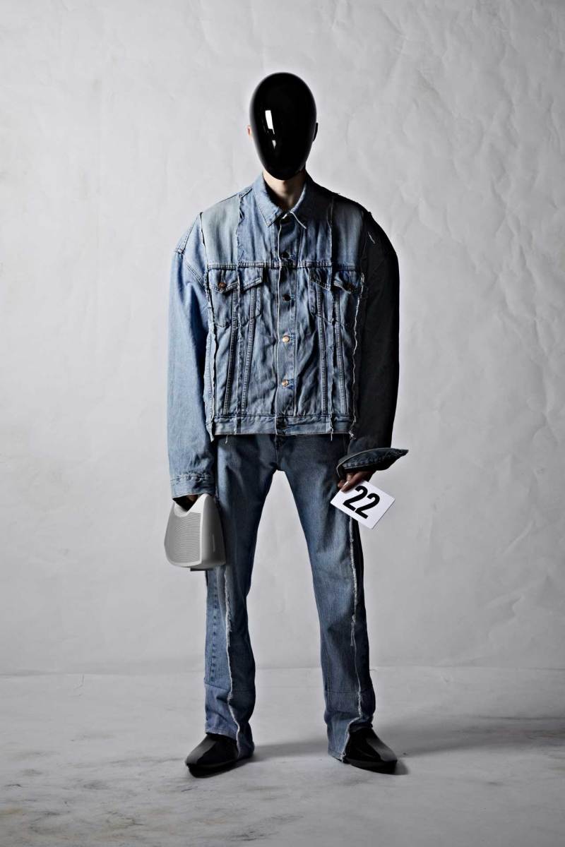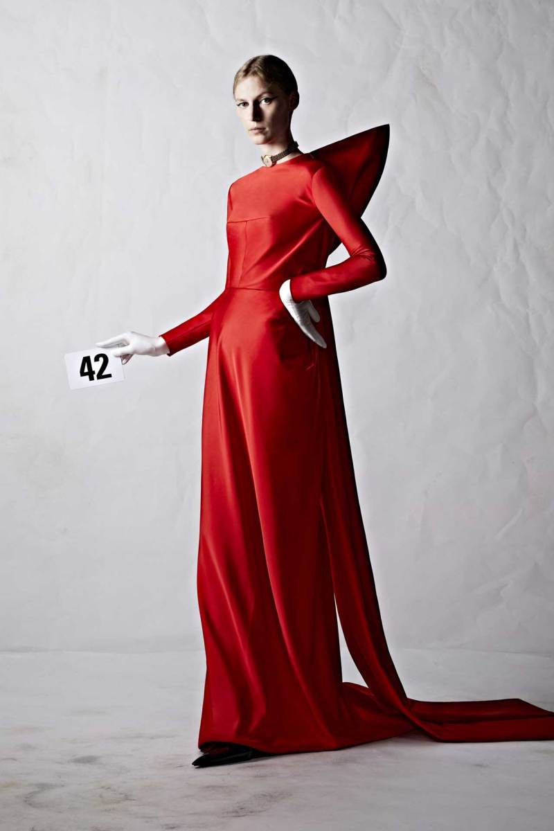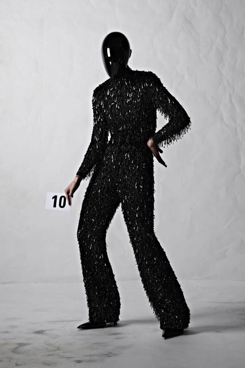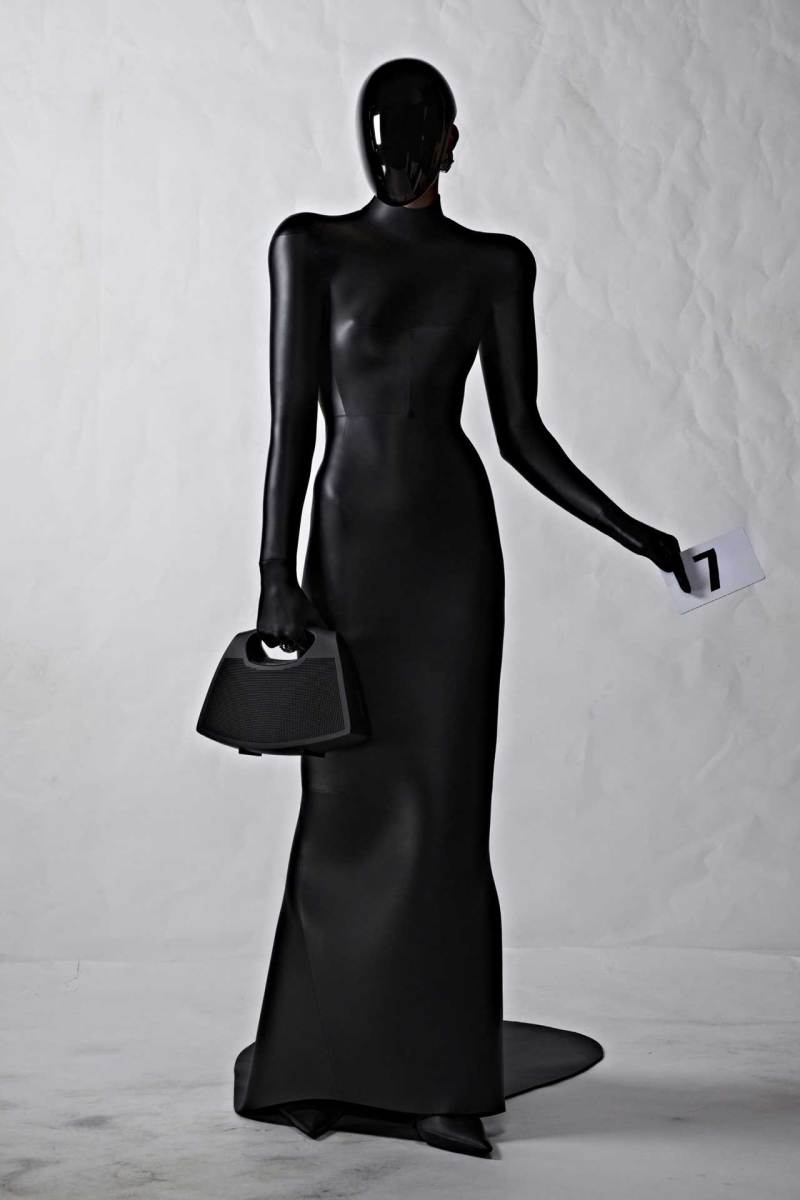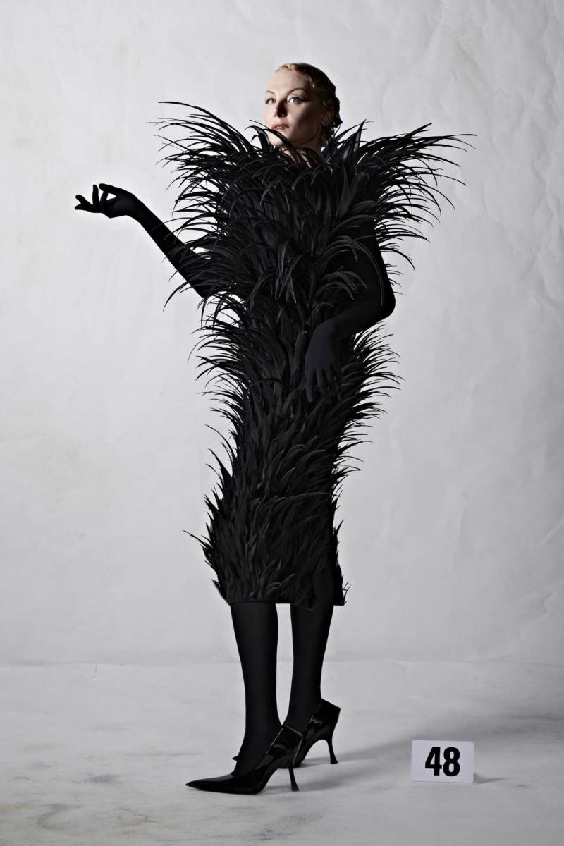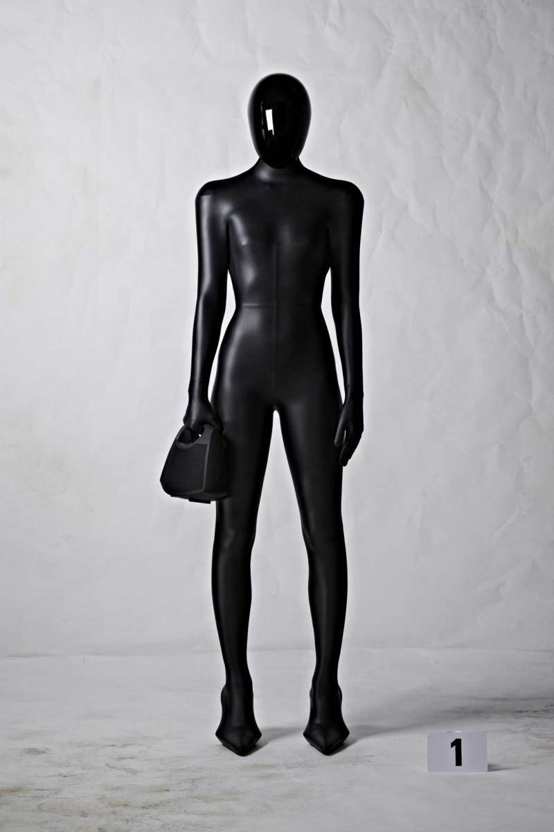 Lo spettacolo inizia con tutti i modelli a volto scoperto che indossano abiti realizzati perlopiù in moderno neoprene, reminiscenza del tessuto Gazar di Cristobal, con al braccio le borse speaker realizzate con Bang&Olufsen. Tutti i materiali della collezione sono stati riciclati.