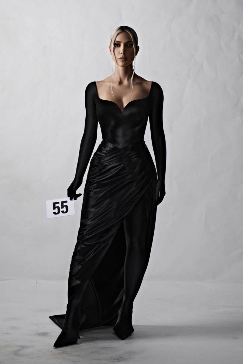 Kim Kardashian, per l’occasione, è comparsa in passerella avvolta in un abito a sirena effetto seconda pelle a maniche lunghe, total black da capo a piedi, con un generoso scollo sul décolleté. Nel pubblico la famiglia Kardashian sfoggia i super occhiali dallo stile iconico che aveva catturato l’attenzione dei fotografi in molte star.