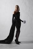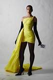 Ad aprire il finale, Dua Lipa, in abito giallo corto monospalla drappeggiato, indossato con calze velate e guanti lunghi (gli stessi della Kidman). Naomi Campbell onora il suo nome con un maxi dress a corolla plissé vittoriano, che lascia libero solo il volto. Infine, Bella Hadid in verde: per lei l’abito più retro e in stile Cristobal, con fiocco sul fronte e senza spalline.