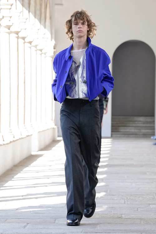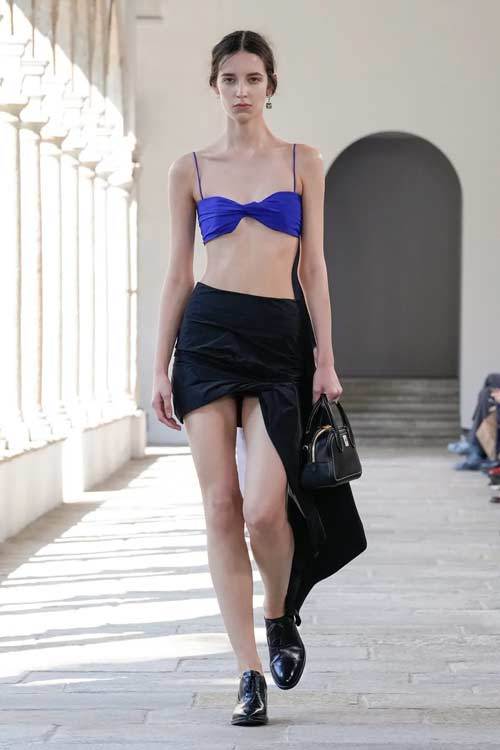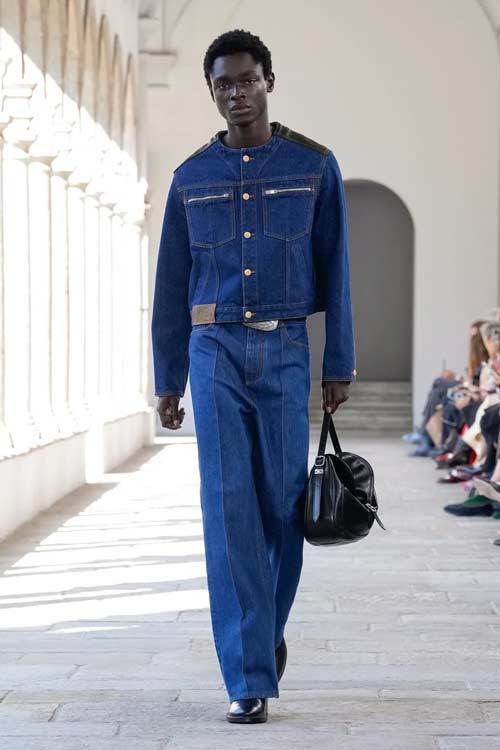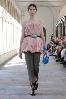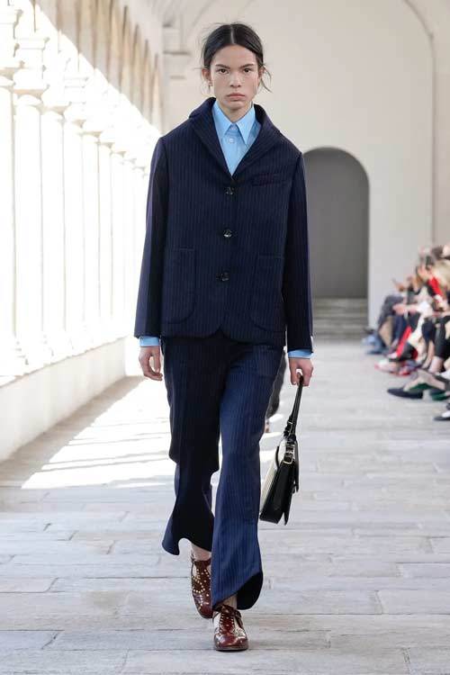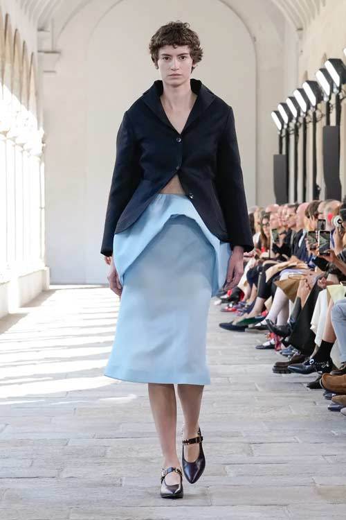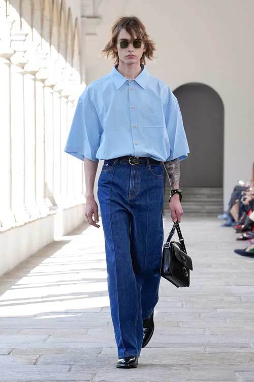 I capi classici come tailleur, pantaloni a sigaretta e camicie bianche vengono reinterpretati con freschezza. I tagli lineari sono sostituiti da silhouette più ampie e rigide, creando un contrasto intrigante che celebra la versatilità del guardaroba. Le camicie azzurre, ad esempio, presentano dettagli innovativi, come bottoni sulla schiena, che trasformano un classico in un must-have moderno.