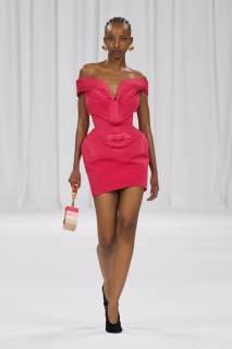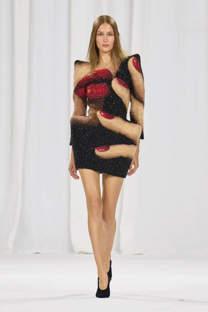La collezione preziosa viene quindi inaugurata con un primo look ad effetto: un minidress dalle forme squadrate e geometriche, ricoperto poi da piccoli strass che ridisegnano l’immagine di una bocca. La cosa che strega è che quest’ultima è, a tutti gli effetti, accompagnata da una mano enorme dalle unghie laccate di rosso. L’effetto che si crea può essere solo di stupore e di meraviglia, soprattutto se considerate le ore spese nella realizzazione di un tale capo di haute couture. Segue un altro outfit estroso, decisamente total black e con un’immagine stampata sopra, anche questa volta con un intricato ricamo a paillettes.