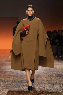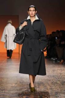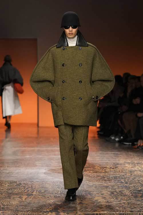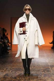 Gli abiti presentati hanno incarnato appieno lo stile inconfondibile del marchio. I trench esagerati hanno conferito un’aria di maestosità a chi li indossava, mentre i dettagli plissé e le texture sofisticate hanno aggiunto profondità e dinamismo alle creazioni. Le longuette in camoscio si muovevano con eleganza, creando un’atmosfera di raffinata grazia.