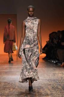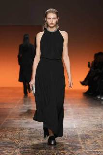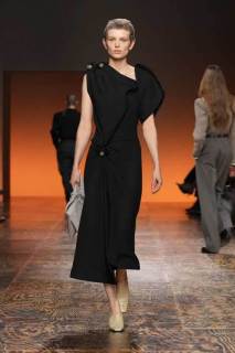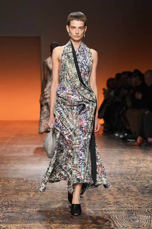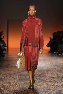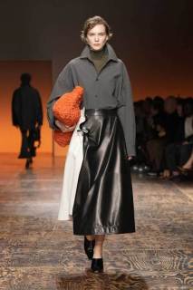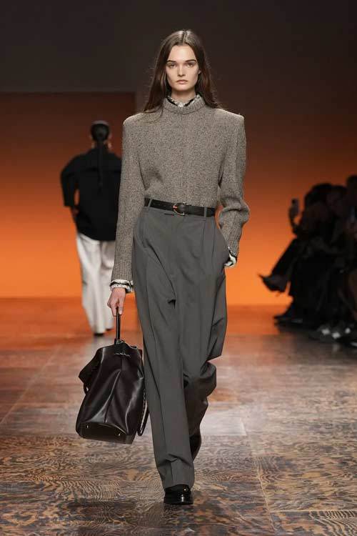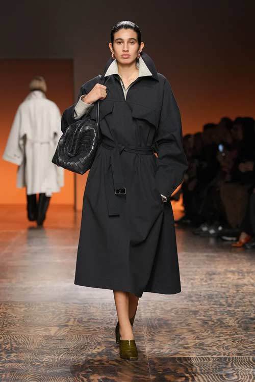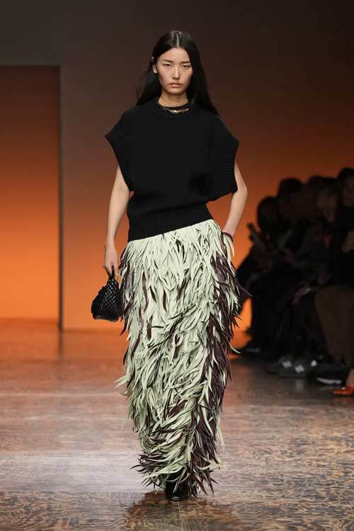 La varietà di tessuti nella collezione era evidente, con l’alternanza di lana e camoscio contrapposti a materiali più tecnici, conferendo un tocco di modernità. L’attenzione ai dettagli è stata palpabile in ogni capo: dalle long skirt e abiti con frange, ai soprabiti dai tagli definiti, alle borse e accessori che riflettevano lo stile distintivo di Bottega Veneta.