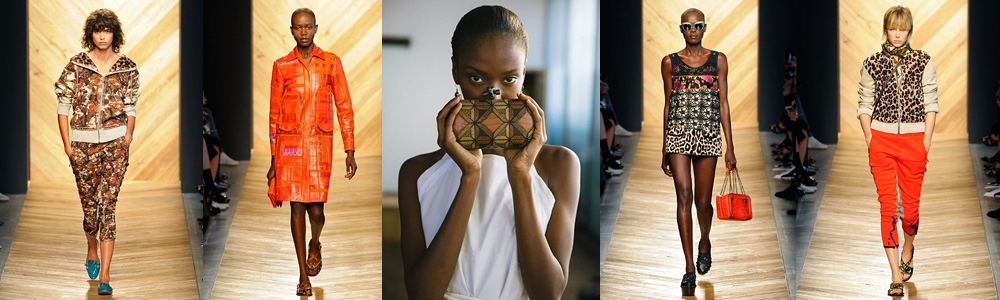 Una collezione pervasa dall’esotismo, che ci fa viaggiare con gli occhi e ci illumina di visioni ispirate all’escursionismo, all’oriente, alle avventure in vela. Il maculato si confonde con un nuovo camouflage pixleato: longuette animalier, zoccoli stile olandese in pitone, giubbini in patchwork di rettile, completi pantalone con la stampa camo. Zoccoli, sandali e ballerine accompagnano anche la serie di abiti, eleganti nel farsi ricordare, più che notare.