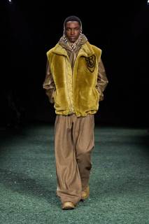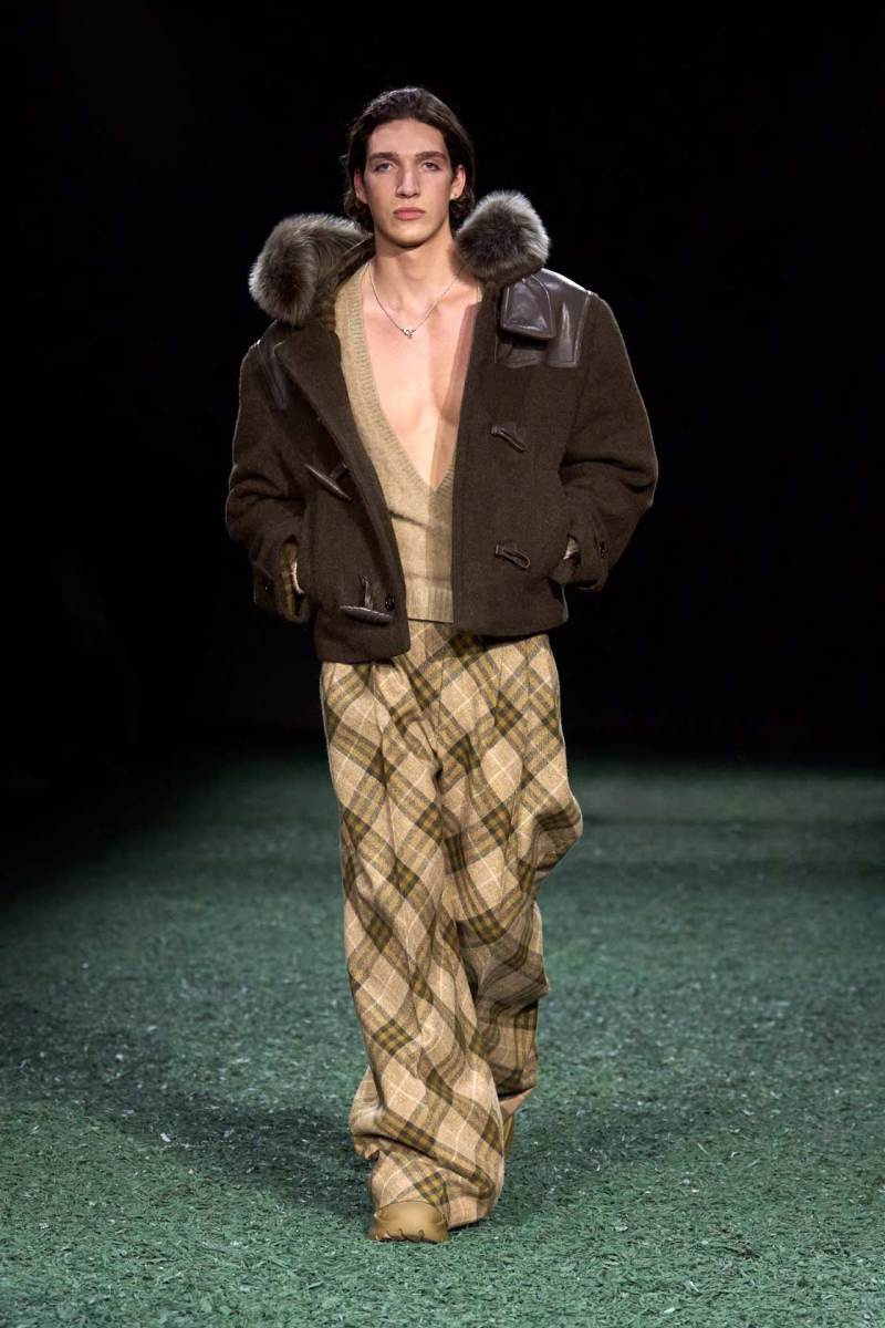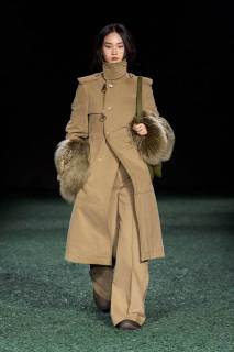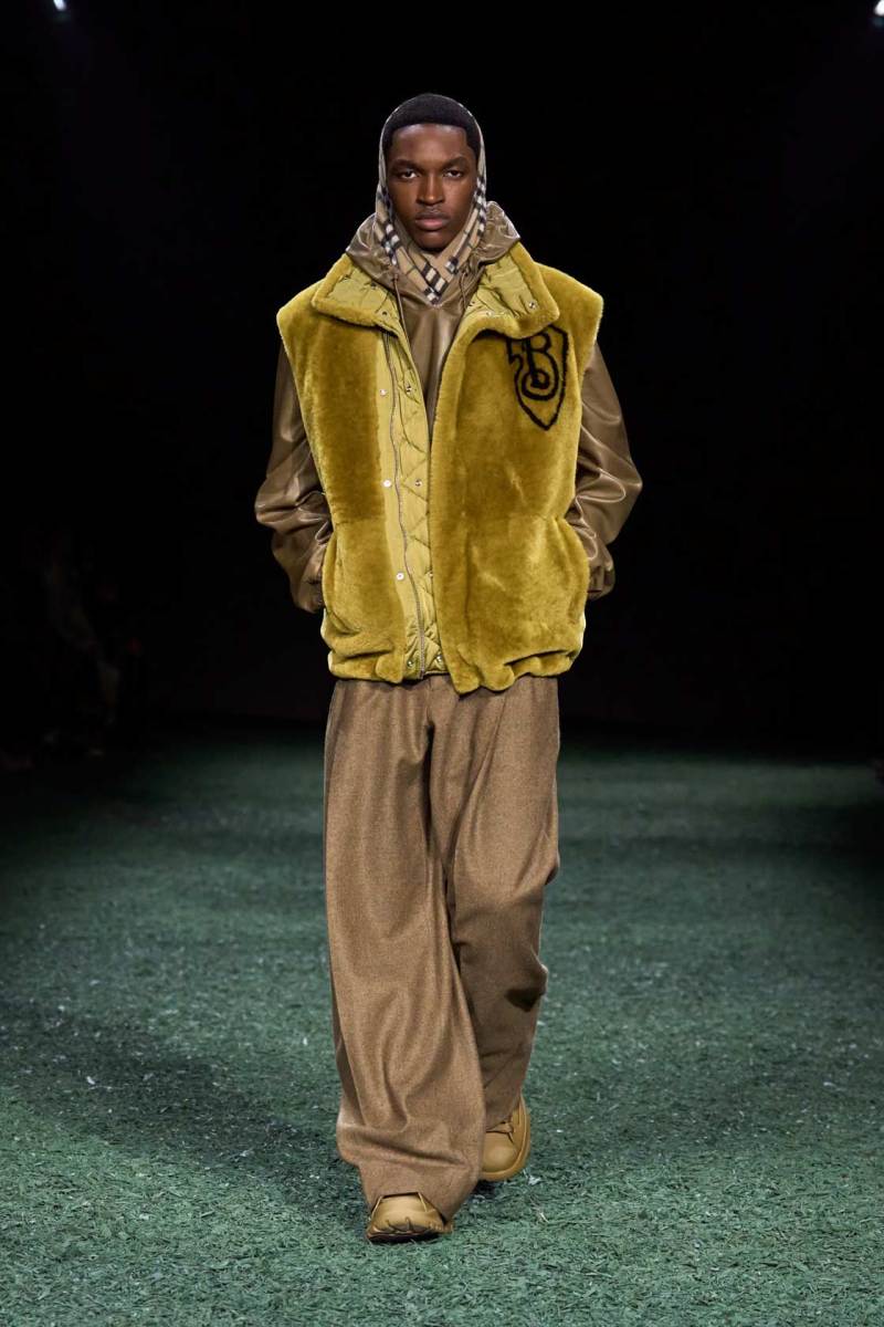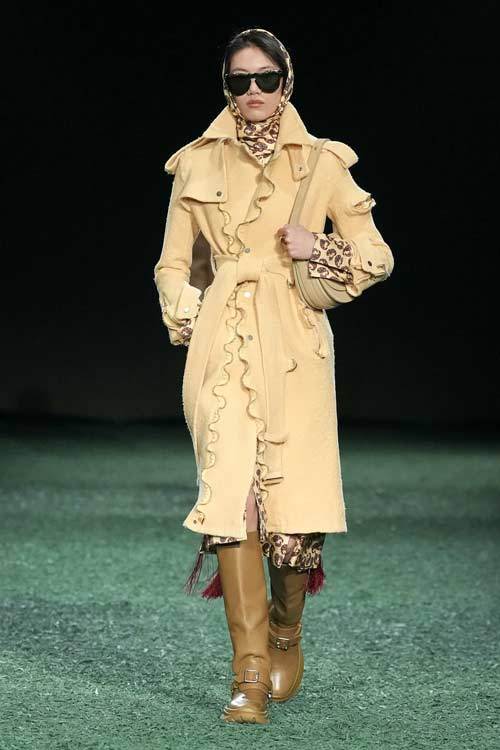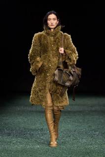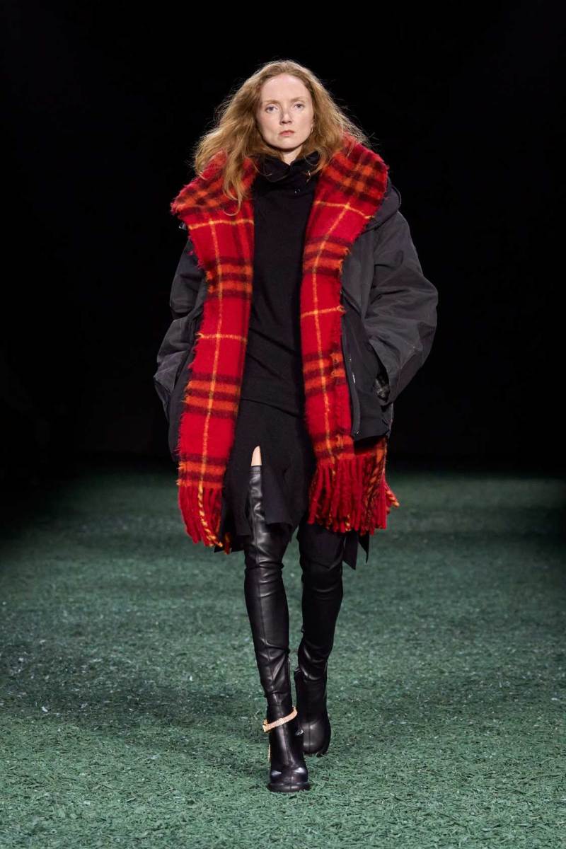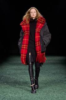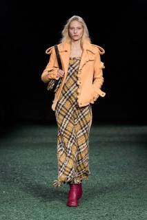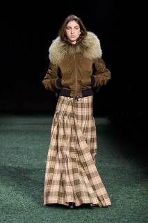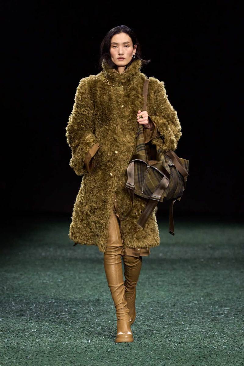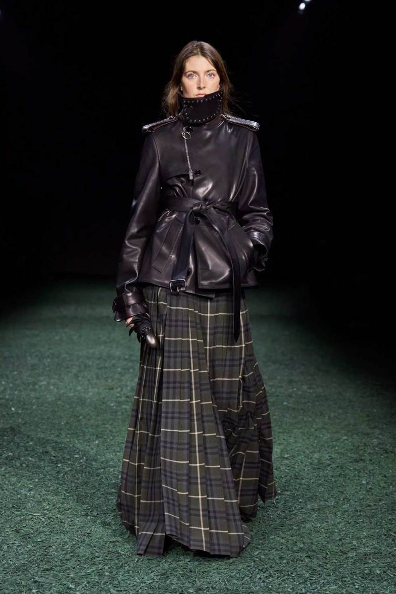 Burberry porta in passerella degli outfit pensati per le occasioni e la vita outdoor. Tra i capi immancabili, i cappotti, i montgomery, le pellicce, i maxi parka, i teddy coat, che vengono abbinati alle gonne lunghe in pelle nera, e le maxi sciarpe che proteggono dal freddo. Gli elementi iconici di Burberry sono onnipresenti: motivi check, ombrelli in tartan, trench; quest’ultimo viene proposto in varie versioni, in pelle con eco fur, lungo, corto, plissettato, in lana. Come calzature si scelgono cuissardes in pelle, stivaletti e bikers ma anche mocassini adornati con nappine. Le tonalità sono calde e terrose.