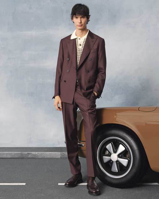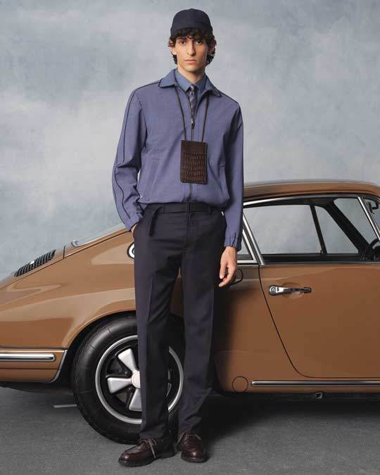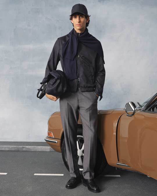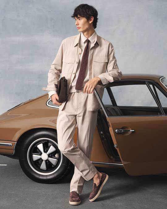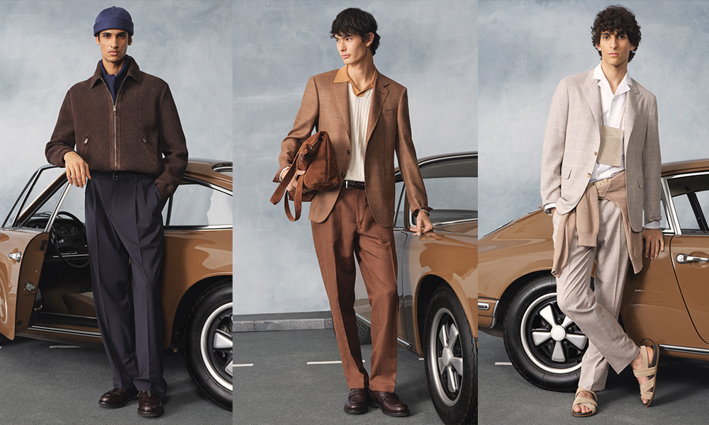 Per la sua collezione Primavera/Estate 2026, Canali ha tratto ispirazione dalle vintage auto da corsa, non tanto la pista quanto il lifestyle che le circonda. “Non si tratta di Formula 1”, spiega Stefano Canali, “ma di un’eleganza che unisce artigianalità, precisione e durata nel tempo”. La sfilata, allestita come una piazza urbana con una Porsche 911 d’epoca sullo sfondo, ha ampliato il significato del lusso dinamico.